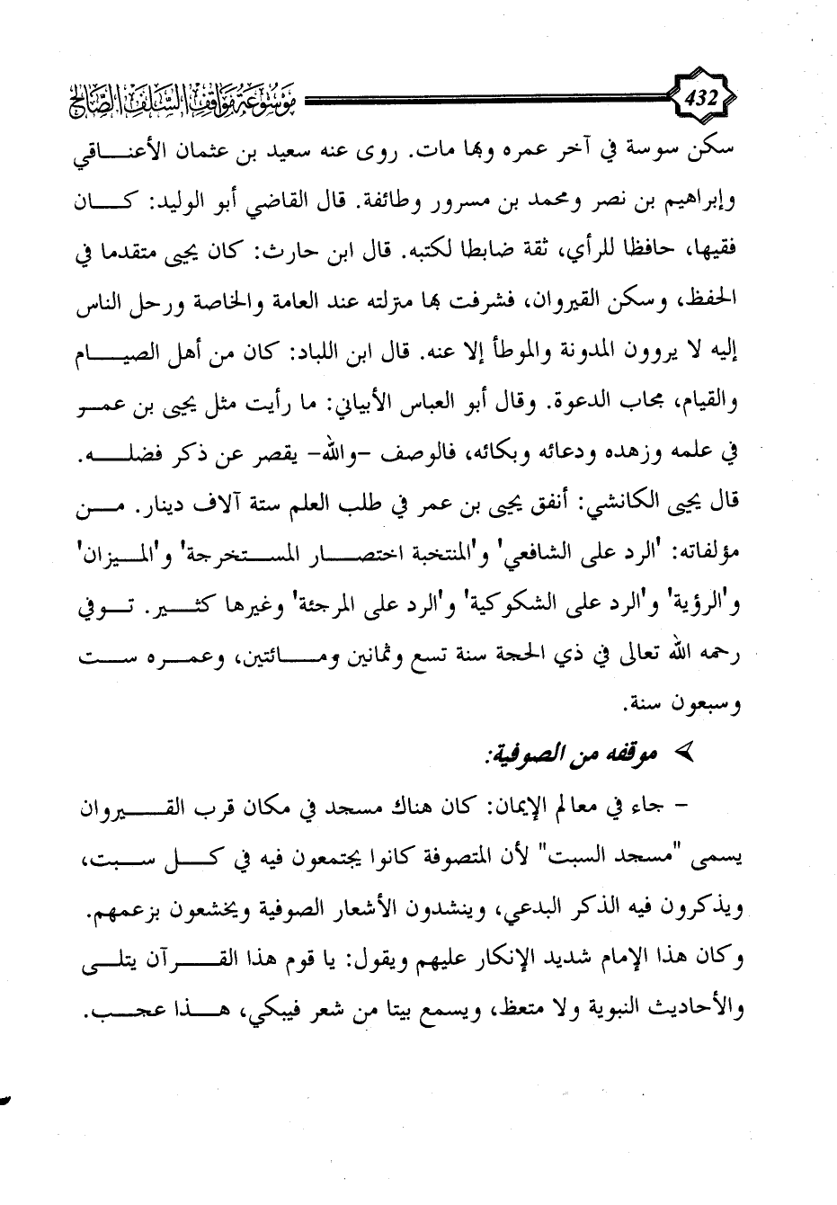- جاء في معالم الإيمان: كان هناك مسجد في مكان قرب القيروان يسمى "مسجد السبت" لأن المتصوفة كانوا يجتمعون فيه في كل سبت، ويذكرون فيه الذكر البدعي، وينشدون الأشعار الصوفية ويخشعون بزعمهم. وكان هذا الإمام شديد الإنكار عليهم ويقول: يا قوم هذا القرآن يتلى والأحاديث النبوية ولا متعظ، ويسمع بيتا من شعر فيبكي، هذا عجب.