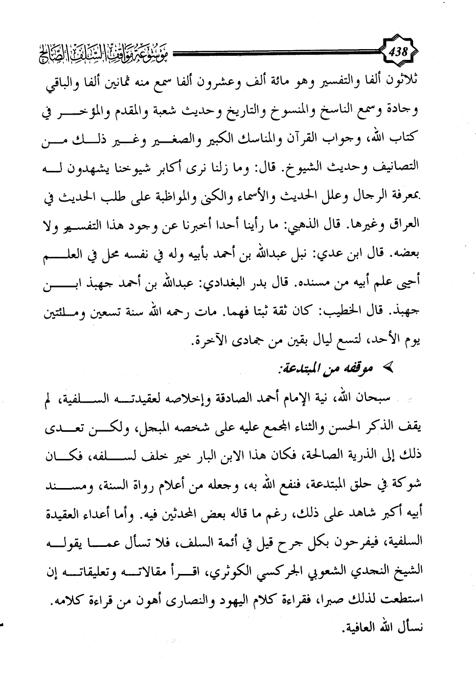 سبحان الله، نية الإمام أحمد الصادقة وإخلاصه لعقيدته السلفية، لم يقف الذكر الحسن والثناء المجمع عليه على شخصه المبجل، ولكن تعدى ذلك إلى الذرية الصالحة، فكان هذا الابن البار خير خلف لسلفه، فكان شوكة في حلق المبتدعة، فنفع الله به، وجعله من أعلام رواة السنة، ومسند أبيه أكبر شاهد على ذلك، رغم ما قاله بعض المحدَثين فيه. وأما أعداء العقيدة السلفية، فيفرحون بكل جرح قيل في أئمة السلف، فلا تسأل عما يقوله الشيخ النجدي الشعوبي الجركسي الكوثري، اقرأ مقالاته وتعليقاته إن استطعت لذلك صبرا، فقراءة كلام اليهود والنصارى أهون من قراءة كلامه. نسأل الله العافية.