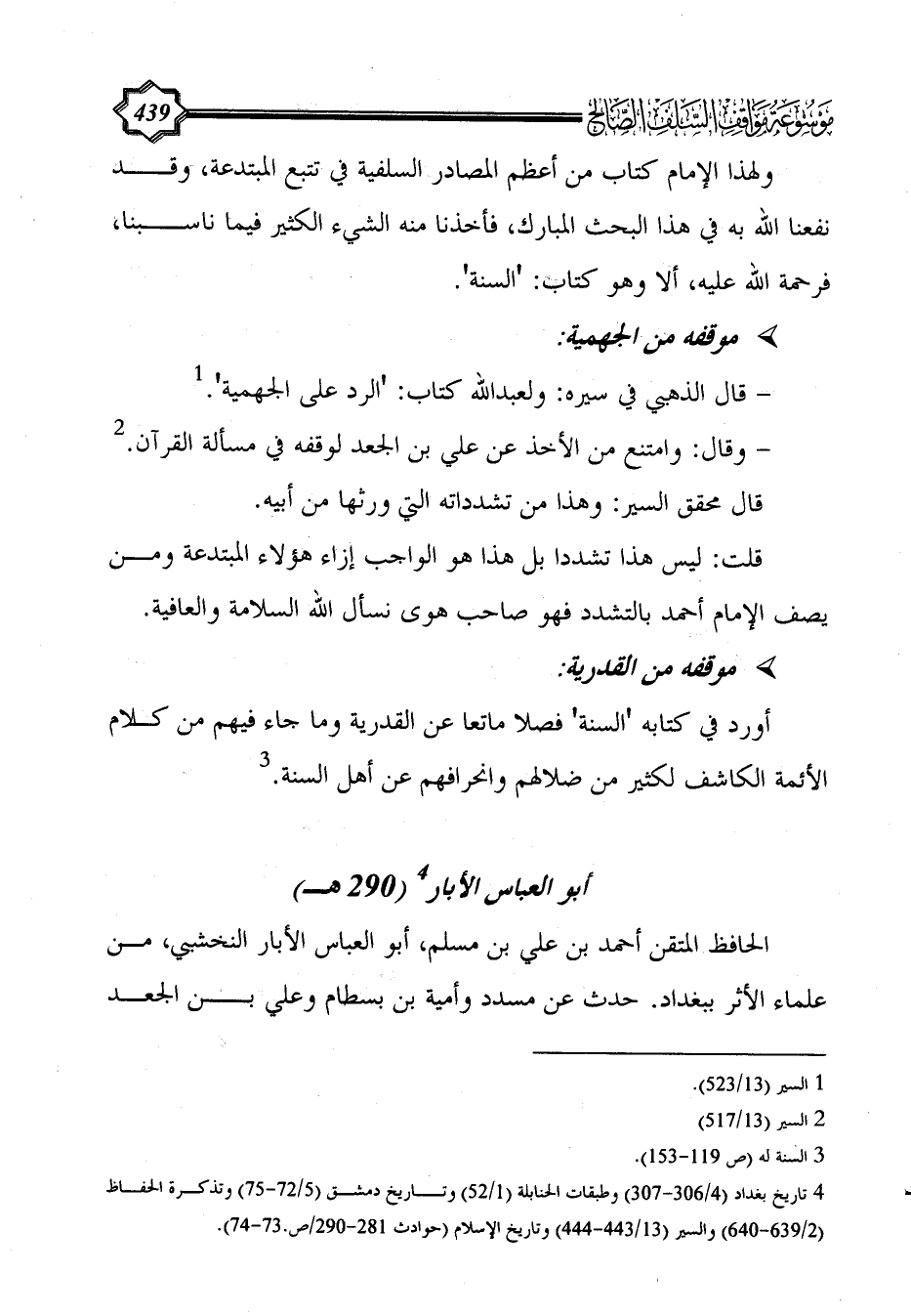 أورد في كتابه 'السنة' فصلا ماتعا عن القدرية وما جاء فيهم من كلام الأئمة الكاشف لكثير من ضلالهم وانحرافهم عن أهل السنة. (¬1)