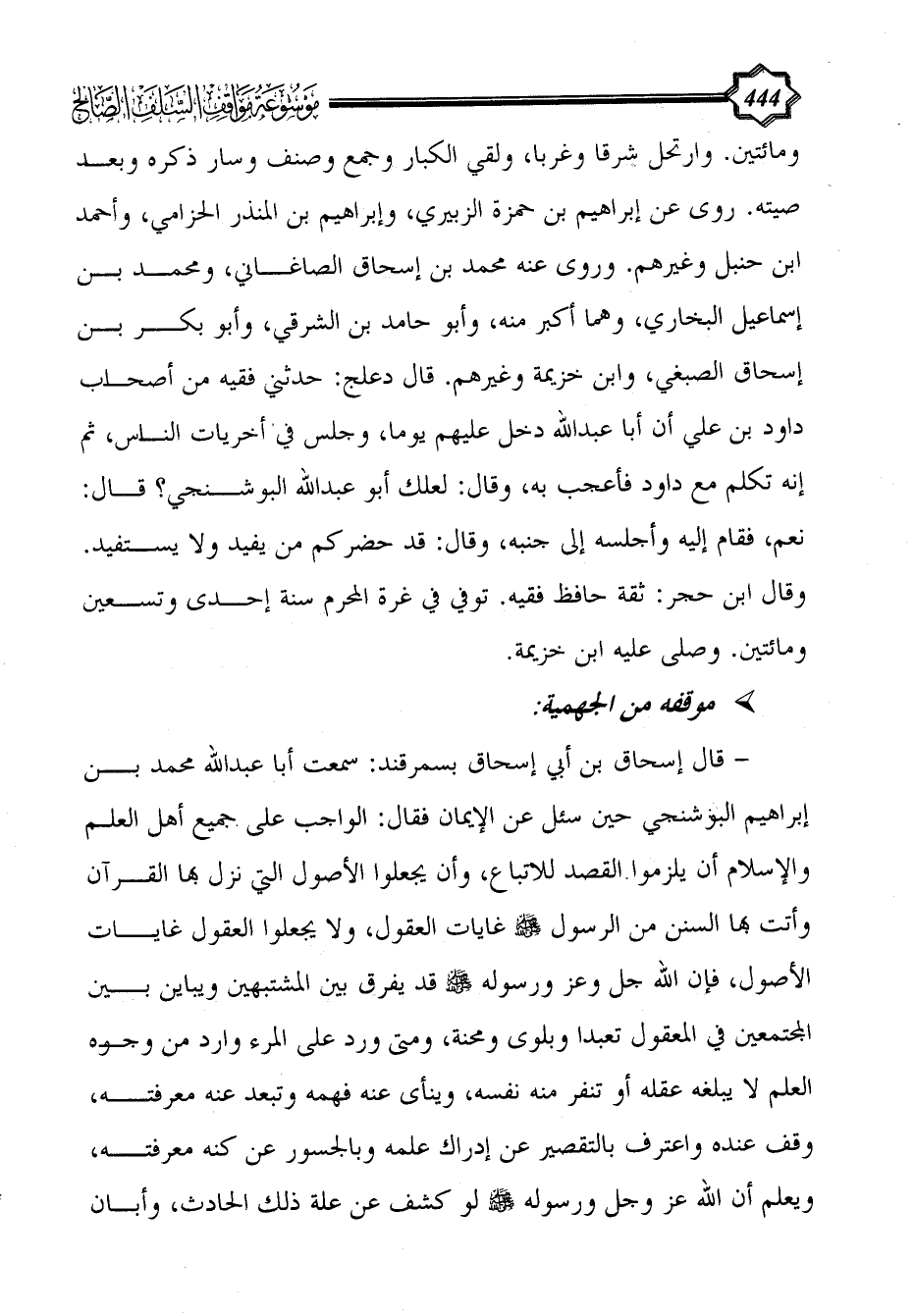 - قال إسحاق بن أبي إسحاق بسمرقند: سمعت أبا عبد الله محمد بن إبراهيم البوشنجي حين سئل عن الإيمان فقال: الواجب على جميع أهل العلم والإسلام أن يلزموا القصد للاتباع، وأن يجعلوا الأصول التي نزل بها القرآن وأتت بها السنن من الرسول - صلى الله عليه وسلم - غايات العقول، ولا يجعلوا العقول غايات الأصول، فإن الله جل وعز ورسوله - صلى الله عليه وسلم - قد يفرق بين المشتبهين ويباين بين المجتمعين في المعقول تعبدا وبلوى ومحنة، ومتى ورد على المرء وارد من وجوه العلم لا يبلغه عقله أو تنفر منه نفسه، وينأى عنه فهمه وتبعد عنه معرفته، وقف عنده واعترف بالتقصير عن إدراك علمه وبالجسور عن كنه معرفته، ويعلم أن الله عز وجل ورسوله - صلى الله عليه وسلم - لو كشف عن علة ذلك الحادث، وأبان
