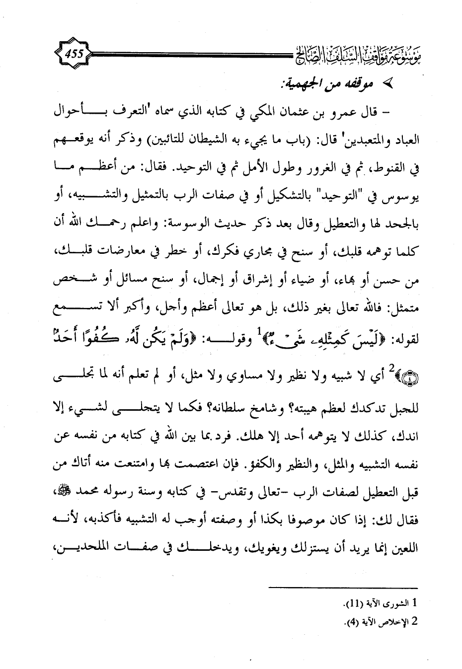 - قال عمرو بن عثمان المكي في كتابه الذي سماه 'التعرف بأحوال العباد والمتعبدين' قال: (باب ما يجيء به الشيطان للتائبين) وذكر أنه يوقعهم في القنوط، ثم في الغرور وطول الأمل ثم في التوحيد. فقال: من أعظم ما يوسوس في "التوحيد" بالتشكيل أو في صفات الرب بالتمثيل والتشبيه، أو بالجحد لها والتعطيل وقال بعد ذكر حديث الوسوسة: واعلم رحمك الله أن كلما توهمه قلبك، أو سنح في مجاري فكرك، أو خطر في معارضات قلبك، من حسن أو بهاء، أو ضياء أو إشراق أو إجمال، أو سنح مسائل أو شخص متمثل: فالله تعالى بغير ذلك، بل هو تعالى أعظم وأجل، وأكبر ألا تسمع لقوله:} {ليس كمثله شيءٌ} (¬1) وقوله: {وَلَمْ يكن لَهُ كُفُوًا أحدٌ} (¬2) أي لا شبيه ولا نظير ولا مساوي ولا مثل، أو لم تعلم أنه لما تجلى للجبل تدكدك لعظم هيبته؟ وشامخ سلطانه؟ فكما لا يتجلى لشيء إلا اندك، كذلك لا يتوهمه أحد إلا هلك. فرد بما بين الله في كتابه من نفسه عن نفسه التشبيه والمثل، والنظير والكفؤ. فإن اعتصمت بها وامتنعت منه أتاك من قبل التعطيل لصفات الرب -تعالى وتقدس- في كتابه وسنة رسوله محمد - صلى الله عليه وسلم -، فقال لك: إذا كان موصوفا بكذا أو وصفته أوجب له التشبيه فأكذبه، لأنه اللعين إنما يريد أن يستزلك ويغويك، ويدخلك في صفات الملحدين،