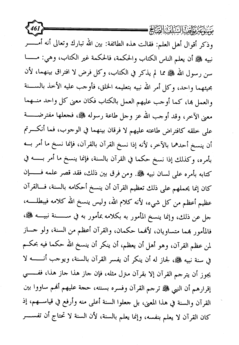 وذكر أقوال أهل العلم: فقالت هذه الطائفة: بين الله تبارك وتعالى أنه أمر نبيه - صلى الله عليه وسلم - أن يعلم الناس الكتاب والحكمة، فالحكمة غير الكتاب، وهي: ما سن رسول الله - صلى الله عليه وسلم - مما لم يذكر في الكتاب، وكل فرض لا افتراق بينهما، لأن مجيئهما واحد، وكل أمر الله نبيه بتعليمه الخلق، فأوجب عليه الأخذ بالسنة والعمل بها، كما أوجب عليهم العمل بالكتاب فكان معنى كل واحد منهما معنى الآخر، وقد أوجب الله عز وجل طاعة رسوله - صلى الله عليه وسلم -، فجعلها مفترضة على خلقه كافتراض طاعته عليهم لا فرقان بينهما في الوجوب، فما أنكرتم أن ينسخ أحدهما بالآخر، لأنه إذا نسخ القرآن بالقرآن، فإنما نسخ ما أمر به بأمره، وكذلك إذا نسخ حكما في القرآن بالسنة، فإنما ينسخ ما أمر به في كتابه بأمره على لسان نبيه - صلى الله عليه وسلم -.