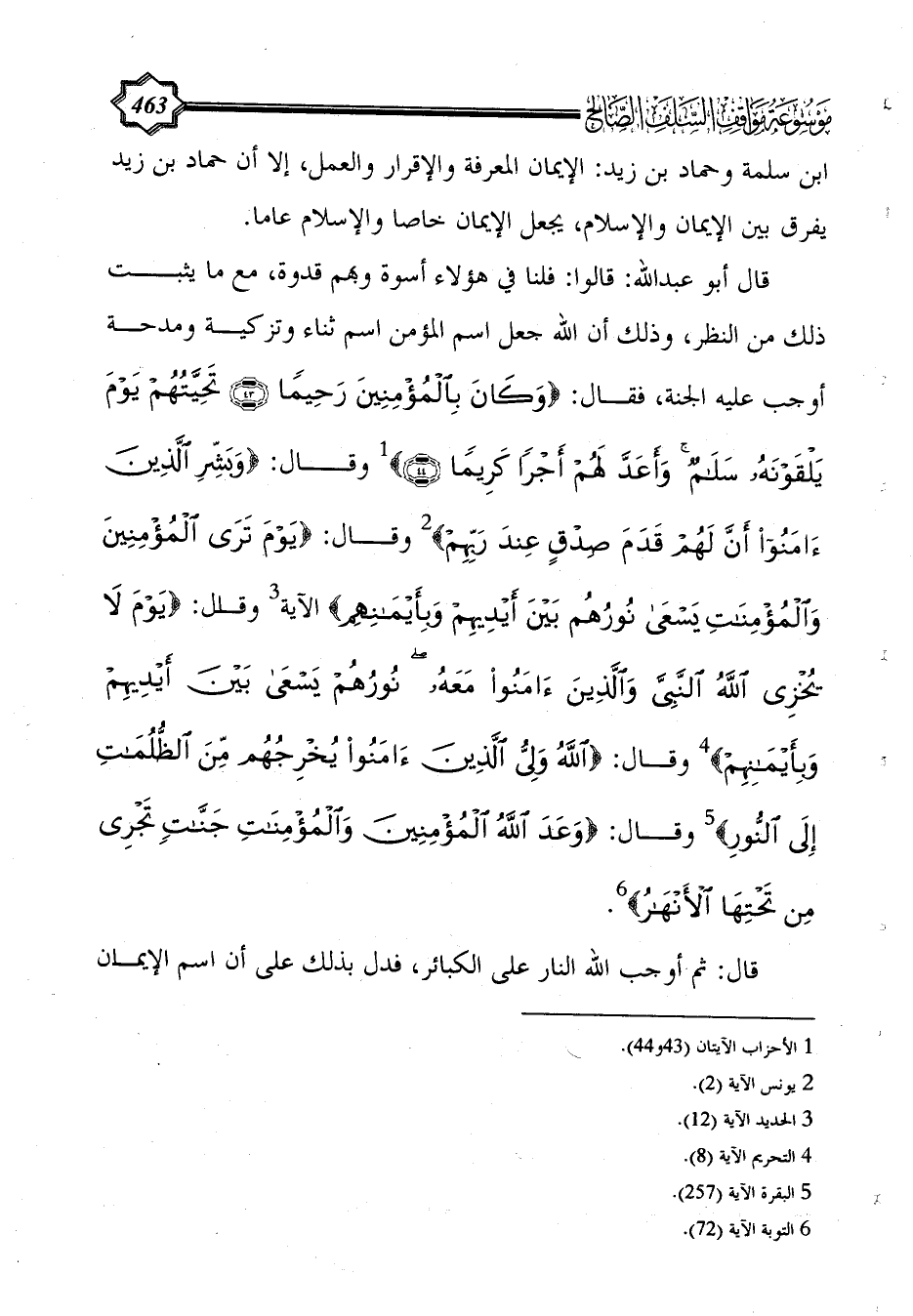 قال أبو عبد الله: قالوا: فلنا في هؤلاء أسوة وبهم قدوة، مع ما يثبت ذلك من النظر، وذلك أن الله جعل اسم المؤمن اسم ثناء وتزكية ومدحة أوجب عليه الجنة، فقال: {وَكَانَ بِالْمُؤْمِنِينَ رَحِيمًا (43) تَحِيَّتُهُمْ يَوْمَ يَلْقَوْنَهُ سَلَامٌ وَأَعَدَّ لَهُمْ أَجْرًا كَرِيمًا} (¬1) وقال: {وَبَشِّرِ الَّذِينَ آمَنُوا أَنَّ لَهُمْ قَدَمَ صِدْقٍ عِنْدَ رَبِّهِمْ} (¬2) وقال: {يَوْمَ تَرَى الْمُؤْمِنِينَ وَالْمُؤْمِنَاتِ يَسْعَى نُورُهُمْ بَيْنَ أَيْدِيهِمْ وَبِأَيْمَانِهِمْ} الآية (¬3) وقال: {يَوْمَ لَا يُخْزِي اللَّهُ النَّبِيَّ وَالَّذِينَ آمَنُوا مَعَهُ نُورُهُمْ يَسْعَى بَيْنَ أَيْدِيهِمْ وَبِأَيْمَانِهِمْ} (¬4) وقال: {اللَّهُ وَلِيُّ الَّذِينَ آمَنُوا يُخْرِجُهُمْ مِنَ الظُّلُمَاتِ إِلَى النُّورِ} (¬5) وقال: {وَعَدَ اللَّهُ الْمُؤْمِنِينَ وَالْمُؤْمِنَاتِ جَنَّاتٍ تَجْرِي مِنْ تَحْتِهَا الْأَنْهَارُ} (¬6).