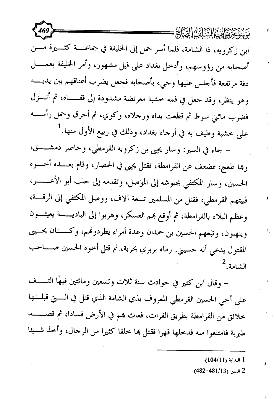 - جاء في السير: وسار يحيى بن زكرويه القرمطي، وحاصر دمشق، وبها طغج، فضعف عن القرامطة، فقتل يحيى في الحصار، وقام بعده أخوه الحسين، وسار المكتفي بجيوشه إلى الموصل، وتقدمه إلى حلب أبو الأغر، فبيتهم القرمطي، فقتل من المسلمين تسعة آلاف، ووصل المكتفي إلى الرقة، وعظم البلاء بالقرامطة، ثم أوقع بهم العسكر، وهربوا إلى البادية يعيثون وينهبون، وتبعهم الحسين بن حمدان وعدة أمراء يطردونهم، وكان يحيى المقتول يدعي أنه حسيني. رماه بربري بحربة، ثم قتل أخوه الحسين صاحب الشامة. (¬2)