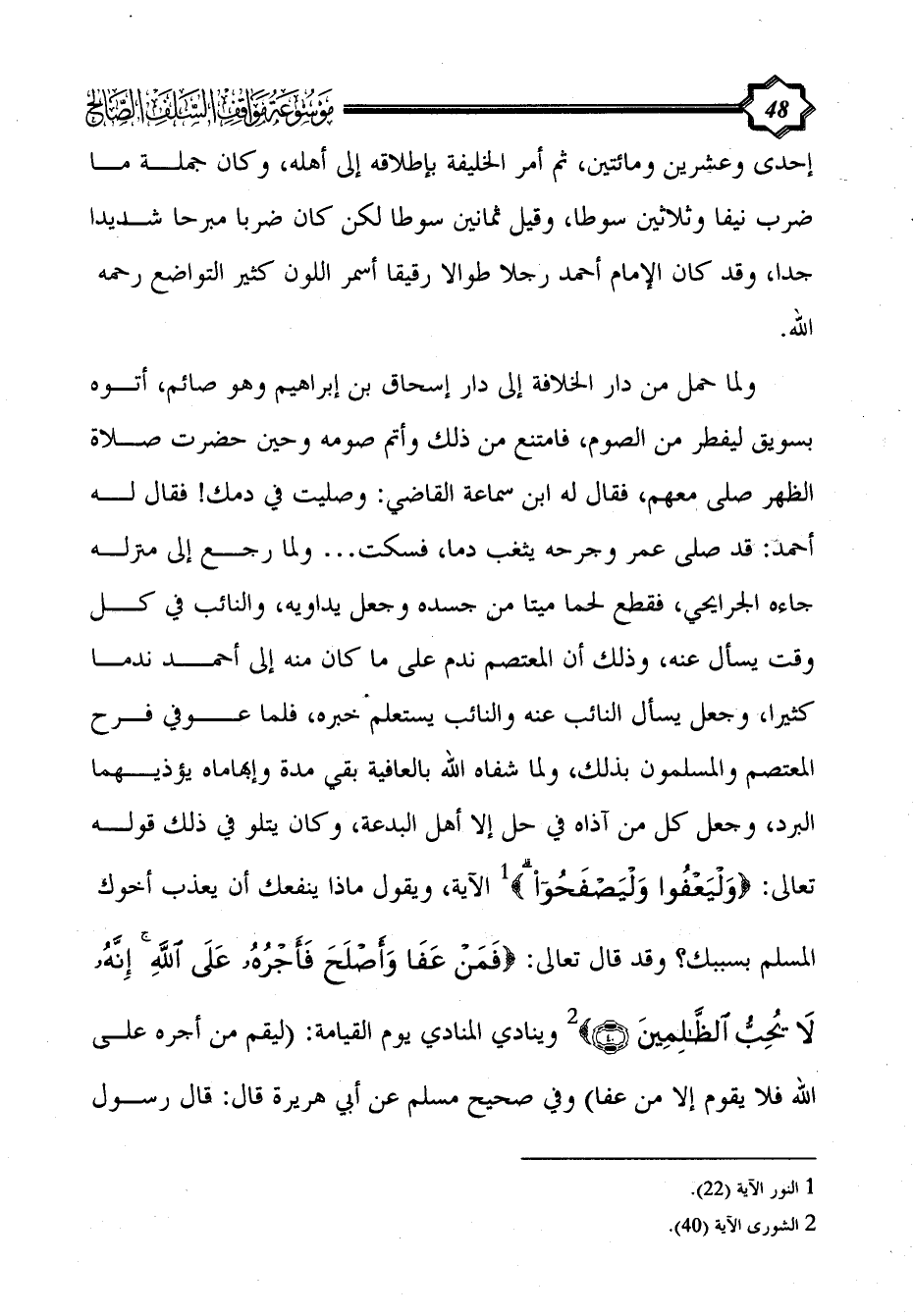ولما حمل من دار الخلافة إلى دار إسحاق بن إبراهيم وهو صائم، أتوه بسويق ليفطر من الصوم، فامتنع من ذلك وأتم صومه وحين حضرت صلاة الظهر صلى معهم، فقال له ابن سماعة القاضي: وصليت في دمك! فقال له أحمد: قد صلى عمر وجرحه يثعب دما، فسكت ... ولما رجع إلى منزله جاءه الجرايحي، فقطع لحما ميتا من جسده وجعل يداويه، والنائب في كل وقت يسأل عنه، وذلك أن المعتصم ندم على ما كان منه إلى أحمد ندما كثيرا، وجعل يسأل النائب عنه والنائب يستعلم خبره، فلما عوفي فرح المعتصم والمسلمون بذلك، ولما شفاه الله بالعافية بقي مدة وإبهاماه يؤذيهما البرد، وجعل كل من آذاه في حل إلا أهل البدعة، وكان يتلو في ذلك قوله تعالى: {وليعفوا وليصفحوا} (¬1) الآية، ويقول ماذا ينفعك أن يعذب أخوك المسلم بسببك؟ وقد قال تعالى: {فَمَنْ عَفَا وَأَصْلَحَ فَأَجْرُهُ على اللَّهِ إِنَّهُ لا يحب الظَّالِمِينَ} (¬2) وينادي المنادي يوم القيامة: (ليقم من أجره على الله فلا يقوم إلا من عفا) وفي صحيح مسلم عن أبي هريرة قال: قال رسول