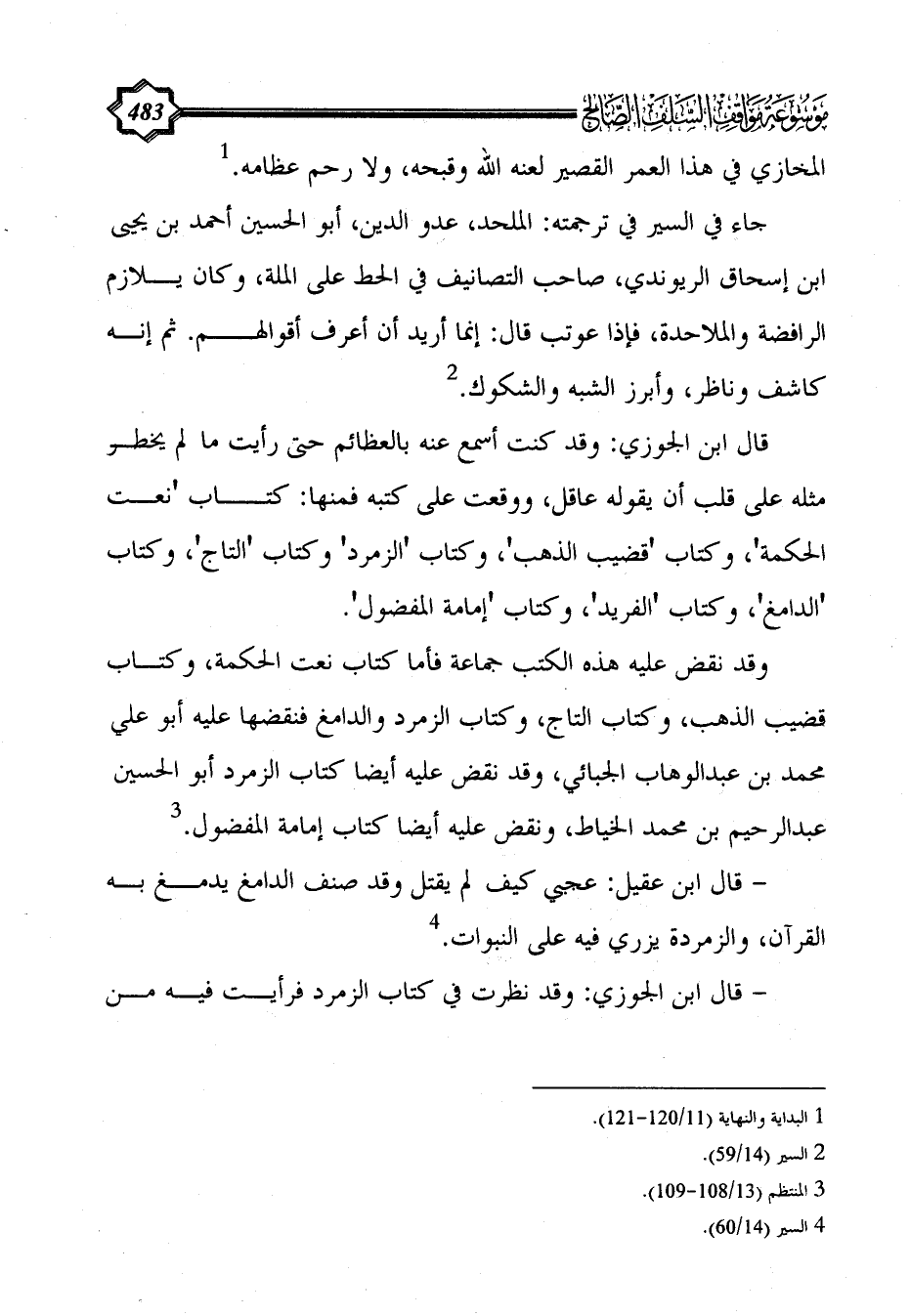 - قال ابن عقيل: عجبي كيف لم يقتل وقد صنف الدامغ يدمغ به القرآن، والزمردة يزري فيه على النبوات. (¬4)
