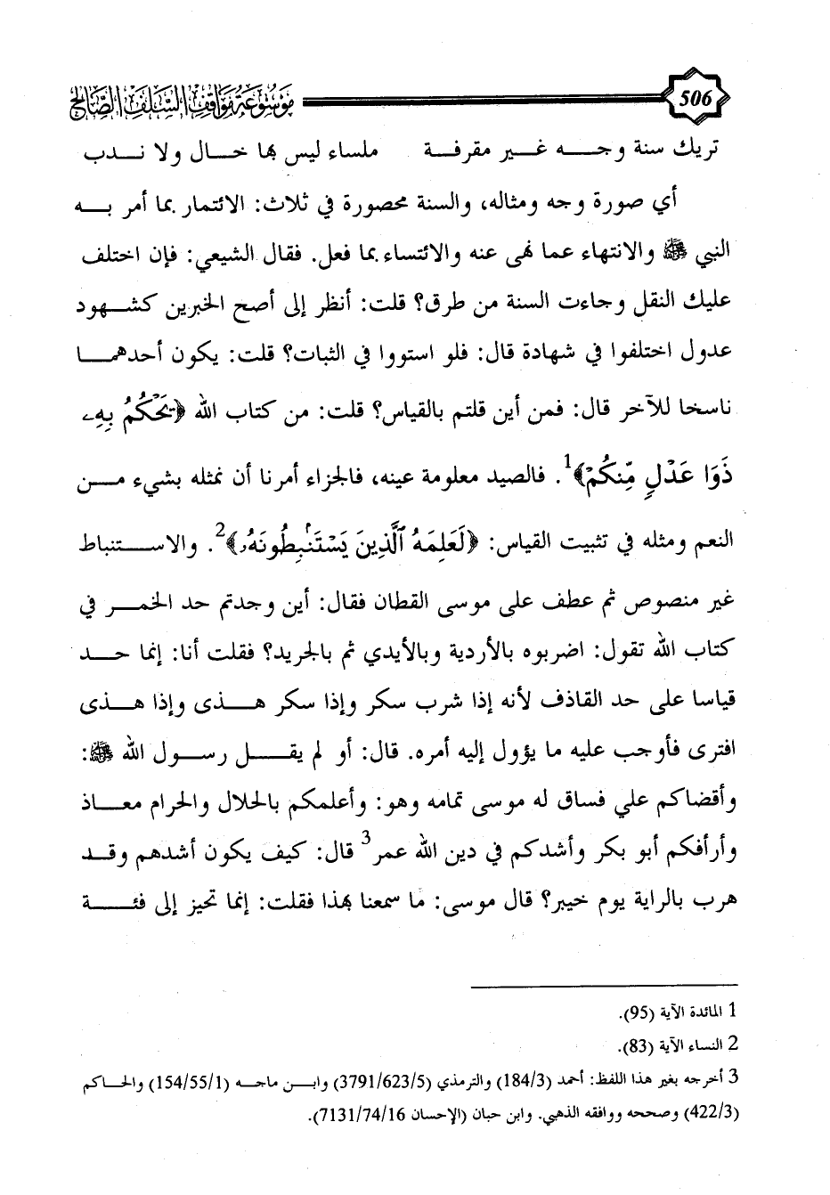 أي صورة وجه ومثاله، والسنة محصورة في ثلاث: الائتمار بما أمر به النبي - صلى الله عليه وسلم - والانتهاء عما نهى عنه والائتساء بما فعل. فقال الشيعي: فإن اختلف عليك النقل وجاءت السنة من طرق؟ قلت: أنظر إلى أصح الخبرين كشهود عدول اختلفوا في شهادة قال: فلو استووا في الثبات؟ قلت: يكون أحدهما ناسخاً للآخر قال: فمن أين قلتم بالقياس؟ قلت: من كتاب الله {يحكم به ذوا عدلٍ مِنْكُمْ} (¬1). فالصيد معلومة عينه، فالجزاء أمرنا أن نمثله بشيء من النعم ومثله في تثبيت القياس: {لَعَلِمَهُ الَّذِينَ يستنبطونه} (¬2). والاستنباط غير منصوص ثم عطف على موسى القطان فقال: أين وجدتم حد الخمر في كتاب الله تقول: اضربوه بالأردية وبالأيدي ثم بالجريد؟ فقلت أنا: إنما حد قياساً على حد القاذف لأنه إذا شرب سكر وإذا سكر هذى وإذا هذى افترى فأوجب عليه ما يؤول إليه أمره. قال: أو لم يقل رسول الله - صلى الله عليه وسلم -: وأقضاكم علي فساق له موسى تمامه وهو: وأعلمكم بالحلال والحرام معاذ وأرأفكم أبو بكر وأشدكم في دين الله عمر (¬3) قال: كيف يكون أشدهم وقد هرب بالراية يوم خيبر؟ قال موسى: ما سمعنا بهذا فقلت: إنما تحيز إلى فئة
