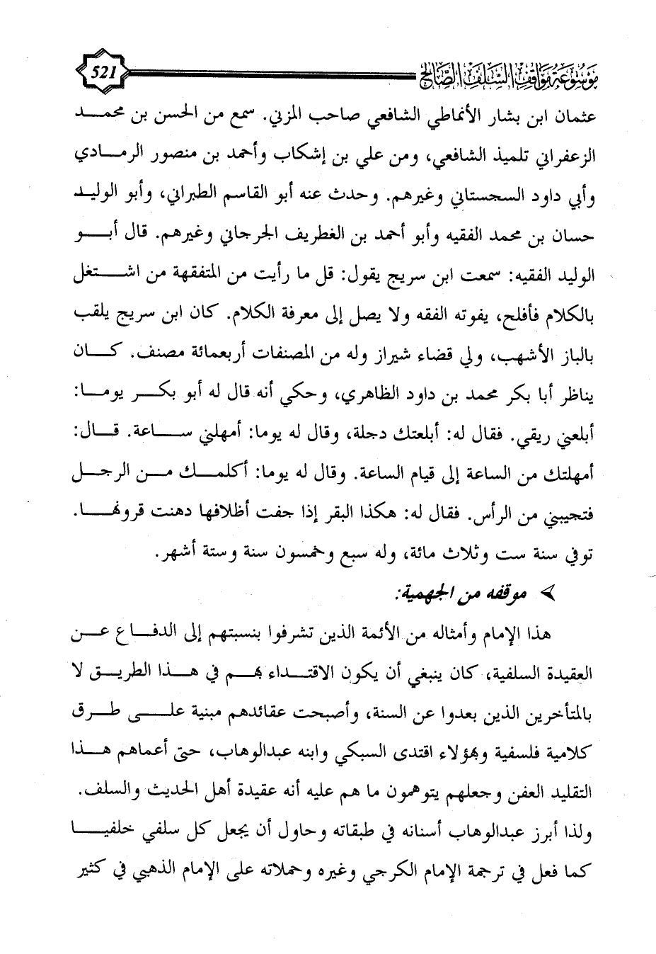 هذا الإمام وأمثاله من الأئمة الذين تشرفوا بنسبتهم إلى الدفاع عن العقيدة السلفية، كان ينبغي أن يكون الاقتداء بهم في هذا الطريق لا بالمتأخرين الذين بعدوا عن السنة، وأصبحت عقائدهم مبنية على طرق كلامية فلسفية وبهؤلاء اقتدى السبكي وابنه عبد الوهاب، حتى أعماهم هذا التقليد العفن وجعلهم يتوهمون ما هم عليه أنه عقيدة أهل الحديث والسلف. ولذا أبرز عبد الوهاب أسنانه في طبقاته وحاول أن يجعل كل سلفي خلفياً كما فعل في ترجمة الإمام الكرجي وغيره وحملاته على الإمام الذهبي في كثير