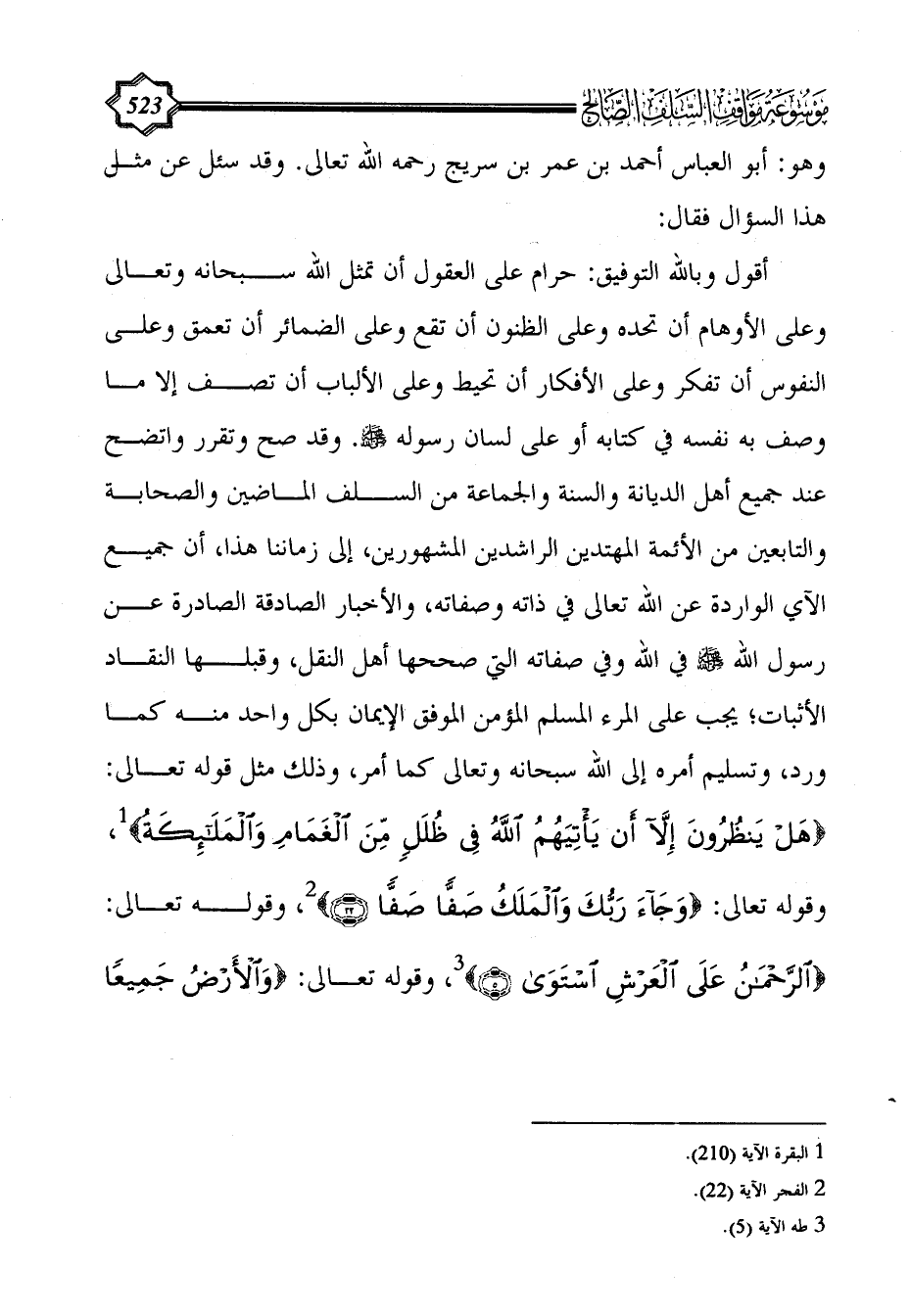أقول وبالله التوفيق: حرام على العقول أن تمثل الله سبحانه وتعالى وعلى الأوهام أن تحده وعلى الظنون أن تقع وعلى الضمائر أن تعمق وعلى النفوس أن تفكر وعلى الأفكار أن تحيط وعلى الألباب أن تصف إلا ما وصف به نفسه في كتابه أو على لسان رسوله - صلى الله عليه وسلم -. وقد صح وتقرر واتضح عند جميع أهل الديانة والسنة والجماعة من السلف الماضين والصحابة والتابعين من الأئمة المهتدين الراشدين المشهورين، إلى زماننا هذا، أن جميع الآي الواردة عن الله تعالى في ذاته وصفاته، والأخبار الصادقة الصادرة عن رسول الله - صلى الله عليه وسلم - في الله وفي صفاته التي صححها أهل النقل، وقبلها النقاد الأثبات؛ يجب على المرء المسلم المؤمن الموفق الإيمان بكل واحد منه كما ورد، وتسليم أمره إلى الله سبحانه وتعالى كما أمر، وذلك مثل قوله تعالى: {هَلْ يَنْظُرُونَ إِلَّا أَنْ يَأْتِيَهُمُ اللَّهُ فِي ظُلَلٍ مِنَ الْغَمَامِ وَالْمَلَائِكَةُ} (¬1)، وقوله تعالى: {وَجَاءَ ربك وَالْمَلَكُ صَفًّا صَفًّا} (¬2)، وقوله تعالى: {الرحمن على العرش استوى} (¬3)، وقوله تعالى: {والأرض جميعًا