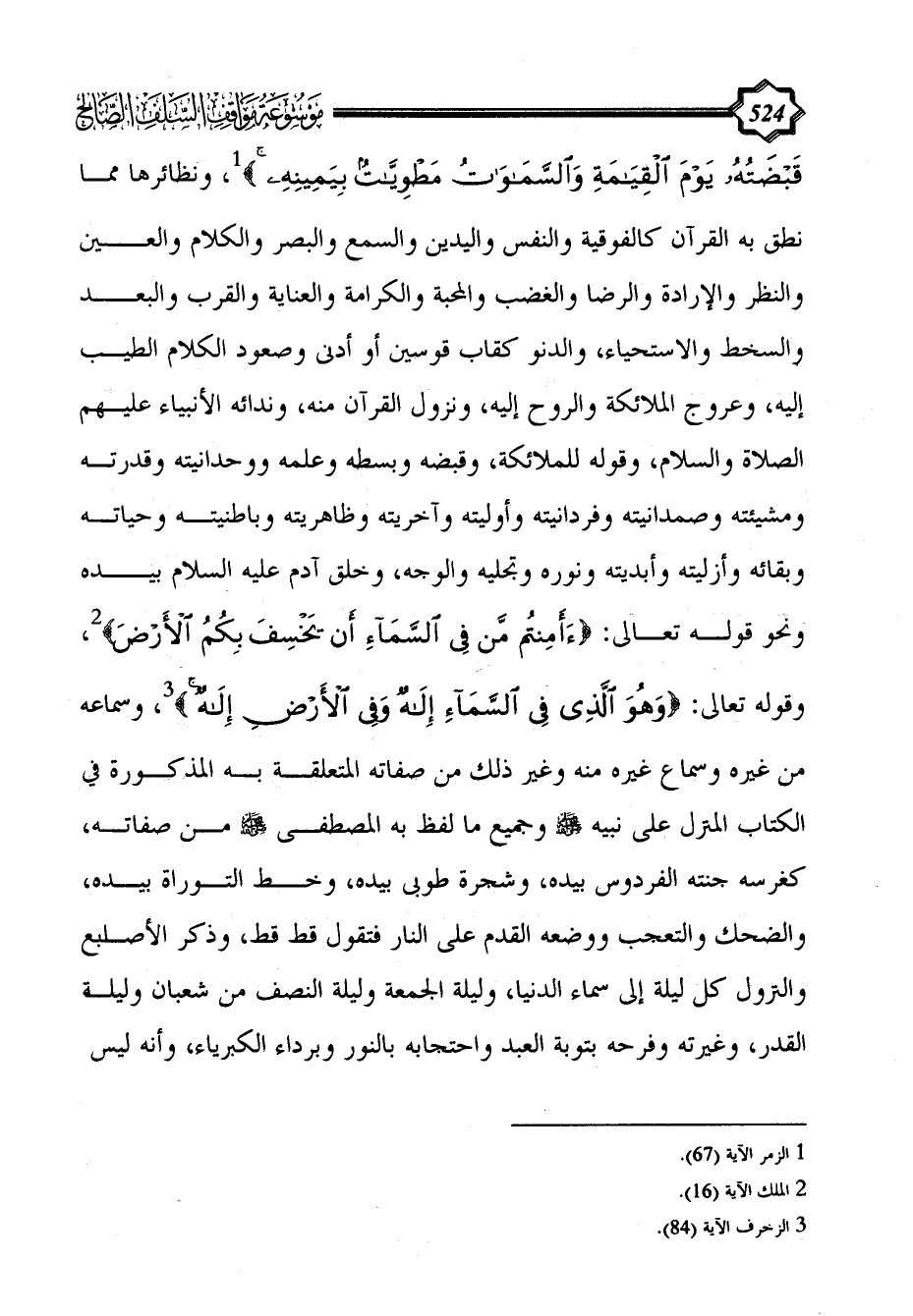 قَبْضَتُهُ يَوْمَ الْقِيَامَةِ وَالسَّمَاوَاتُ مَطْوِيَّاتٌ بِيَمِينِهِ} (¬1)،ونظائرها مما نطق به القرآن كالفوقية والنفس واليدين والسمع والبصر والكلام والعين والنظر والإرادة والرضا والغضب والمحبة والكرامة والعناية والقرب والبعد والسخط والاستحياء، والدنوّ كقاب قوسين أو أدنى وصعود الكلام الطيب إليه، وعروج الملائكة والروح إليه، ونزول القرآن منه، وندائه الأنبياء عليهم الصلاة والسلام، وقوله للملائكة، وقبضه وبسطه وعلمه ووحدانيته وقدرته ومشيئته وصمدانيته وفردانيته وأوليته وآخريته وظاهريته وباطنيته وحياته وبقائه وأزليته وأبديته ونوره وتجليه والوجه، وخلق آدم عليه السلام بيده ونحو قوله تعالى: {أَأَمِنْتُمْ مَنْ فِي السَّمَاءِ أَنْ يَخْسِفَ بِكُمُ الْأَرْضَ} (¬2)، وقوله تعالى: {وَهُوَ الَّذِي فِي السَّمَاءِ إِلَهٌ وَفِي الْأَرْضِ إِلَهٌ} (¬3)، وسماعه من غيره وسماع غيره منه وغير ذلك من صفاته المتعلقة به المذكورة في الكتاب المنزل على نبيه - صلى الله عليه وسلم - وجميع ما لفظ به المصطفى - صلى الله عليه وسلم - من صفاته، كغرسه جنته الفردوس بيده، وشجرة طوبى بيده، وخط التوراة بيده، والضحك والتعجب ووضعه القدم على النار فتقول قط قط، وذكر الأصابع والنزول كل ليلة إلى سماء الدنيا، وليلة الجمعة وليلة النصف من شعبان وليلة القدر، وغيرته وفرحه بتوبة العبد واحتجابه بالنور وبرداء الكبرياء، وأنه ليس