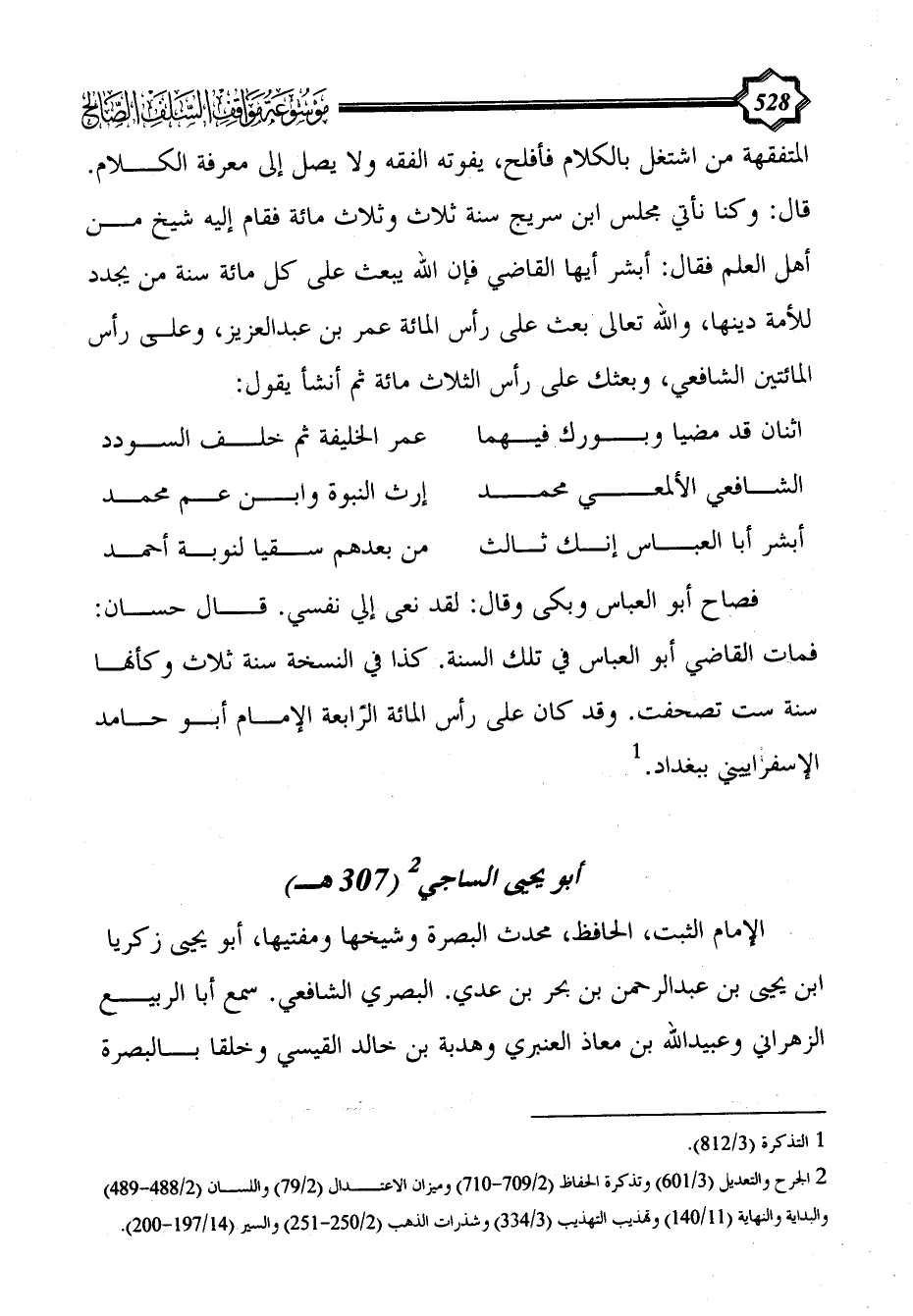 فصاح أبو العباس وبكى وقال: لقد نعى إلي نفسي. قال حسان: فمات القاضي أبو العباس في تلك السنة. كذا في النسخة سنة ثلاث وكأنها سنة ست تصحفت. وقد كان على رأس المائة الرابعة الإمام أبو حامد الإسفراييني ببغداد. (¬1)