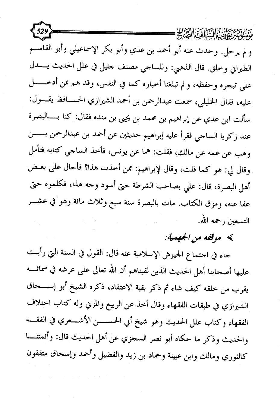 جاء في اجتماع الجيوش الإسلامية عنه قال: القول في السنة التي رأيت عليها أصحابنا أهل الحديث الذين لقيناهم أن الله تعالى على عرشه في سمائه يقرب من خلقه كيف شاء ثم ذكر بقية الاعتقاد، ذكره الشيخ أبو إسحاق الشيرازي في طبقات الفقهاء وقال أخذ عن الربيع والمزني وله كتاب اختلاف الفقهاء وكتاب علل الحديث وهو شيخ أبي الحسن الأشعري في الفقه والحديث وذكر ما حكاه أبو نصر السجزي عن أهل الحديث قال: وأئمتنا كالثوري ومالك وابن عيينة وحماد بن زيد والفضيل وأحمد وإسحاق متفقون