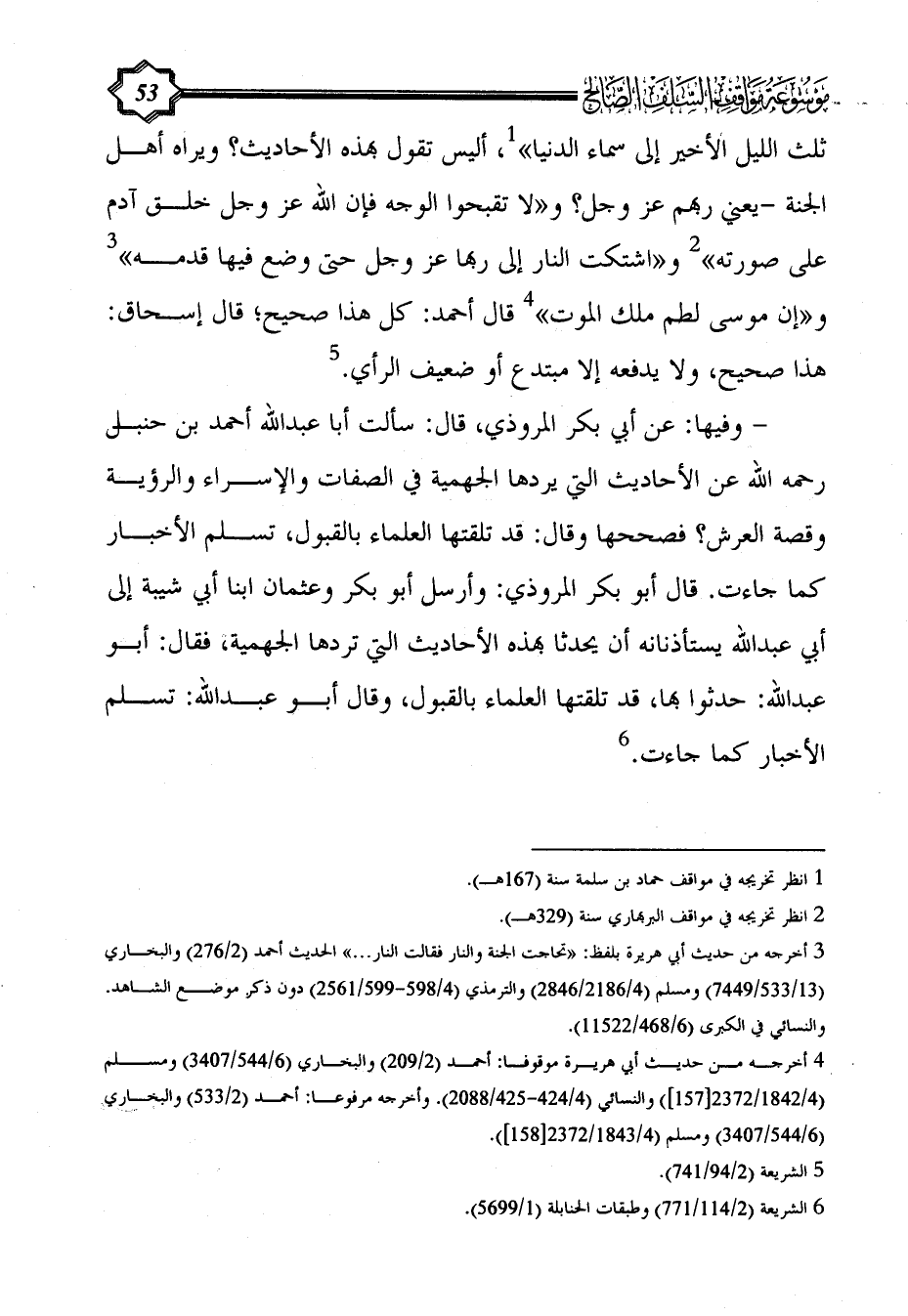- وفيها: عن أبي بكر المروذي، قال: سألت أبا عبد الله أحمد بن حنبل رحمه الله عن الأحاديث التي يردها الجهمية في الصفات والإسراء والرؤية وقصة العرش؟ فصححها وقال: قد تلقتها العلماء بالقبول، تسلم الأخبار كما جاءت. قال أبو بكر المروذي: وأرسل أبو بكر وعثمان ابنا أبي شيبة إلى أبي عبد الله يستأذنانه أن يحدثا بهذه الأحاديث التي تردها الجهمية، فقال: أبو عبد الله: حدثوا بها، قد تلقتها العلماء بالقبول، وقال أبو عبد الله: تسلم الأخبار كما جاءت. (¬6)