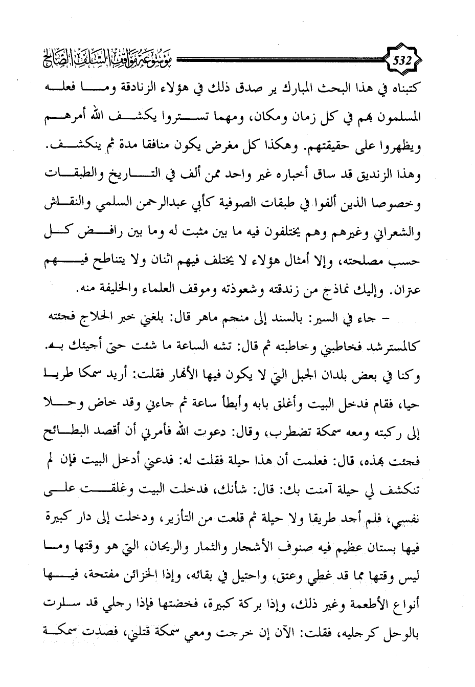 - جاء في السير: بالسند إلى منجم ماهر قال: بلغني خبر الحلاج فجئته كالمسترشد فخاطبني وخاطبته ثم قال: تشهّ الساعة ما شئت حتى أجيئك به. وكنا في بعض بلدان الجبل التي لا يكون فيها الأنهار فقلت: أريد سمكاً طرياً حياً، فقام فدخل البيت وأغلق بابه وأبطأ ساعة ثم جاءني وقد خاض وحلاً إلى ركبته ومعه سمكة تضطرب، وقال: دعوت الله فأمرني أن أقصد البطائح فجئت بهذه، قال: فعلمت أن هذا حيلة فقلت له: فدعني أدخل البيت فإن لم تنكشف لي حيلة آمنت بك: قال: شأنك، فدخلت البيت وغلقت على نفسي، فلم أجد طريقاً ولا حيلة ثم قلعت من التأزير، ودخلت إلى دار كبيرة فيها بستان عظيم فيه صنوف الأشجار والثمار والريحان، التي هو وقتها وما ليس وقتها مما قد غطي وعتق، واحتيل في بقائه، وإذا الخزائن مفتحة، فيها أنواع الأطعمة وغير ذلك، وإذا بِرْكة كبيرة، فخضتها فإذا رجلي قد سارت بالوحل كرجليه، فقلت: الآن إن خرجت ومعي سمكة قتلني، فصدت سمكة