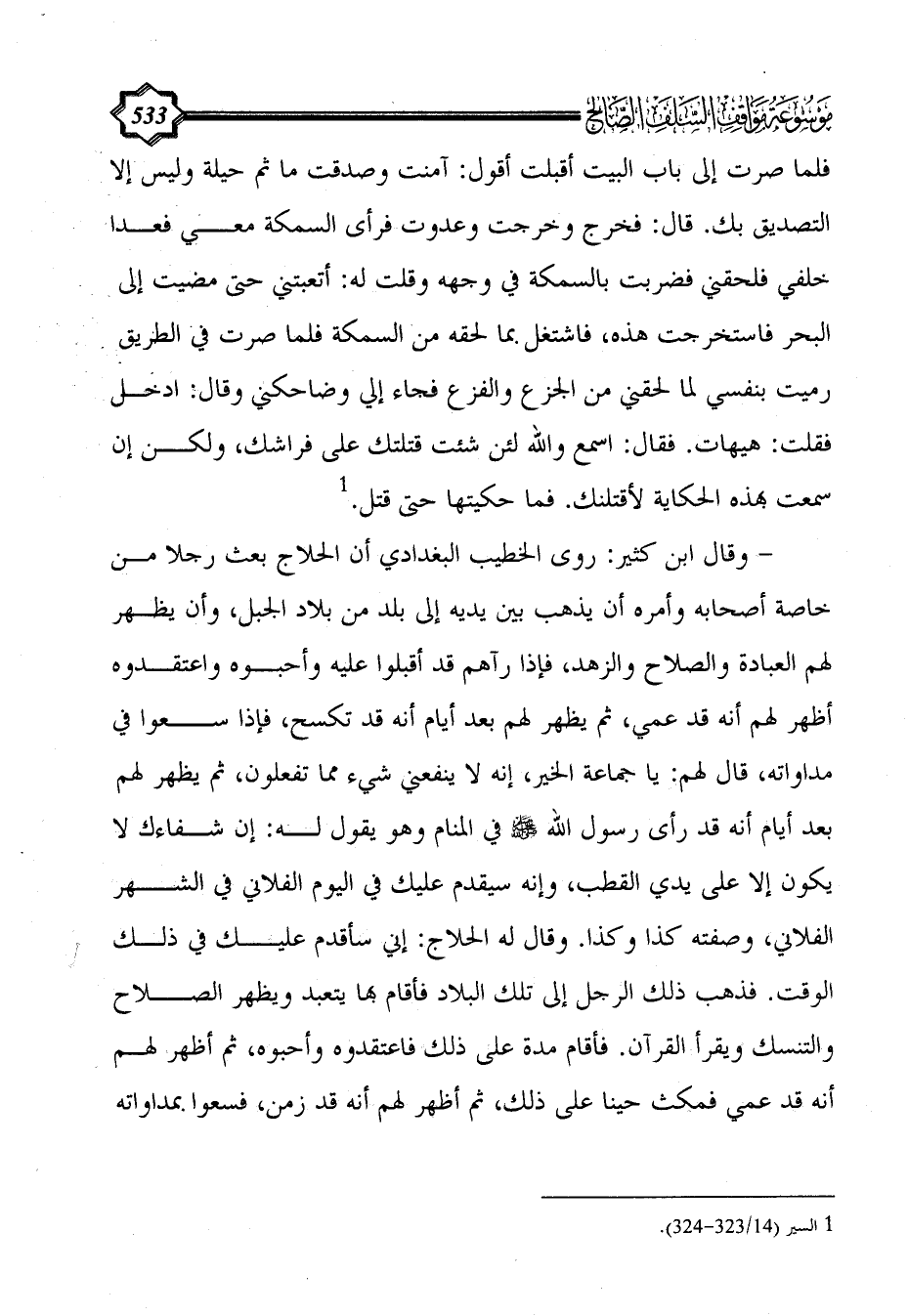 فلما صرت إلى باب البيت أقبلت أقول: آمنت وصدقت ما ثم حيلة وليس إلا التصديق بك. قال: فخرج وخرجت وعدوت فرأى السمكة معي فعدا خلفي فلحقني فضربت بالسمكة في وجهه وقلت له: أتعبتني حتى مضيت إلى البحر فاستخرجت هذه، فاشتغل بما لحقه من السمكة فلما صرت في الطريق رميت بنفسي لما لحقني من الجزع والفزع فجاء إلي وضاحكني وقال: ادخل فقلت: هيهات. فقال: اسمع والله لئن شئت قتلتك على فراشك، ولكن إن سمعت بهذه الحكاية لأقتلنك. فما حكيتها حتى قتل. (¬1)