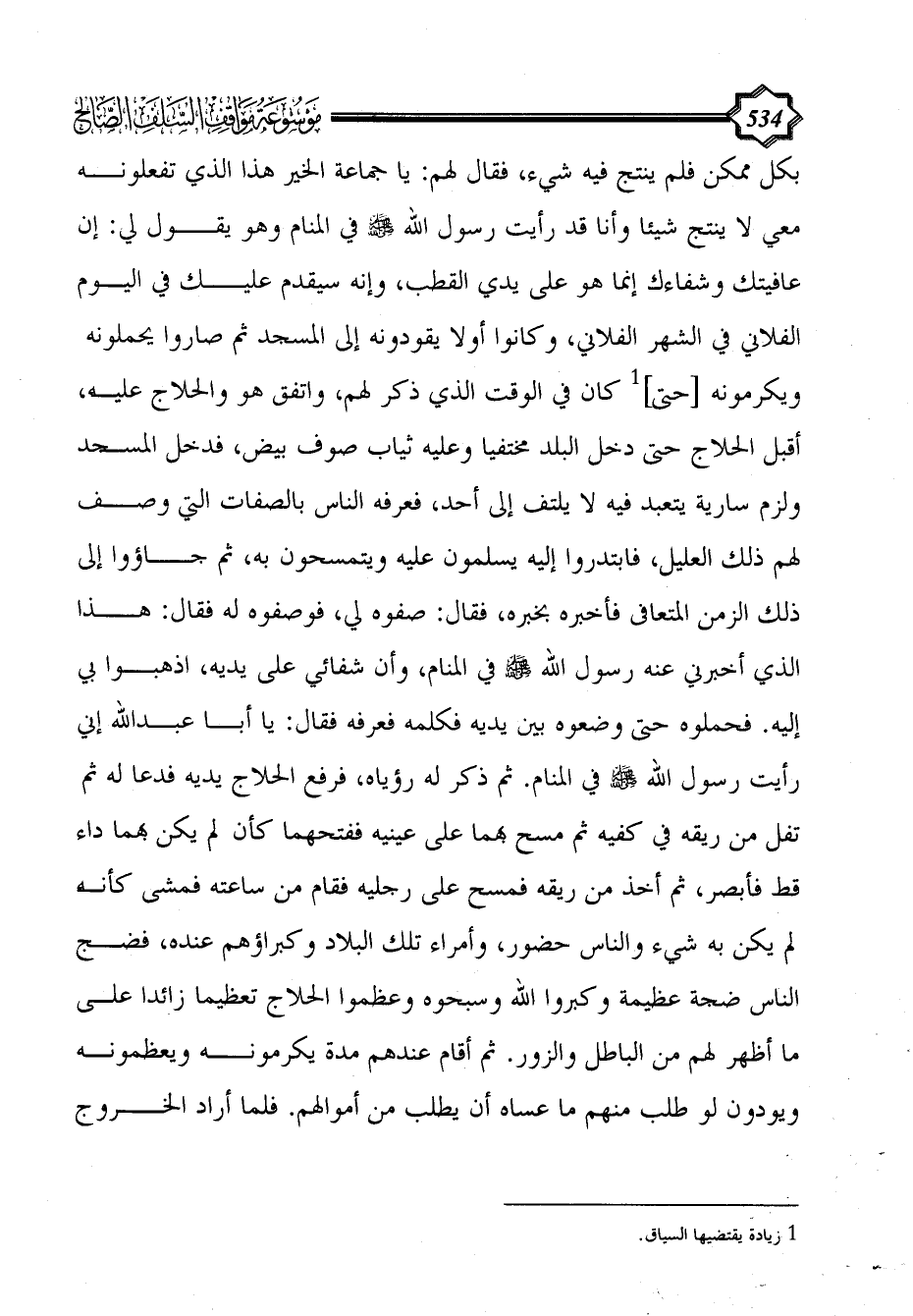 فحملوه حتى وضعوه بين يديه فكلمه فعرفه فقال: يا أبا عبد الله إني رأيت رسول الله - صلى الله عليه وسلم - في المنام. ثم ذكر له رؤياه، فرفع الحلاج يديه فدعا له ثم تفل من ريقه في كفيه ثم مسح بهما على عينيه ففتحهما كأن لم يكن بهما داء قط فأبصر، ثم أخذ من ريقه فمسح على رجليه فقام من ساعته فمشى كأنه لم يكن به شيء والناس حضور، وأمراء تلك البلاد وكبراؤهم عنده، فضج الناس ضجة عظيمة وكبروا الله وسبحوه وعظموا الحلاج تعظيماً زائداً على ما أظهر لهم من الباطل والزور. ثم أقام عندهم مدة يكرمونه ويعظمونه ويودون لو طلب منهم ما عساه أن يطلب من أموالهم. فلما أراد الخروج