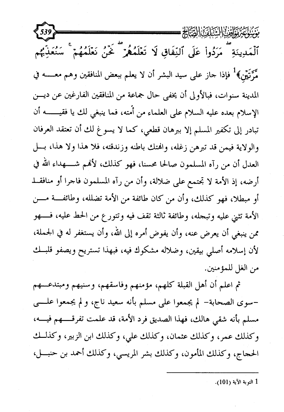 الْمَدِينَةِ مَرَدُوا عَلَى النِّفَاقِ لَا تَعْلَمُهُمْ نَحْنُ نَعْلَمُهُمْ سَنُعَذِّبُهُمْ مَرَّتَيْنِ} (¬1) فإذا جاز على سيد البشر أن لا يعلم ببعض المنافقين وهم معه في المدينة سنوات، فبالأولى أن يخفى حال جماعة من المنافقين الفارغين عن دين الإسلام بعده عليه السلام على العلماء من أمته، فما ينبغي لك يا فقيه أن تبادر إلى تكفير المسلم إلا ببرهان قطعي، كما لا يسوغ لك أن تعتقد العرفان والولاية فيمن قد تبرهن زغله، وانهتك باطنه وزندقته، فلا هذا ولا هذا، بل العدل أن من رآه المسلمون صالحاً محسناً، فهو كذلك، لأنهم شهداء الله في أرضه، إذ الأمة لا تجتمع على ضلالة، وأن من رآه المسلمون فاجراً أو منافقاً أو مبطلاً، فهو كذلك، وأن من كان طائفة من الأمة تضلله، وطائفة من الأمة تثني عليه وتبجله، وطائفة ثالثة تقف فيه وتتورع من الحط عليه، فهو ممن ينبغي أن يعرض عنه، وأن يفوض أمره إلى الله، وأن يستغفر له في الجملة، لأن إسلامه أصلي بيقين، وضلاله مشكوك فيه، فبهذا تستريح ويصفو قلبك من الغل للمؤمنين.