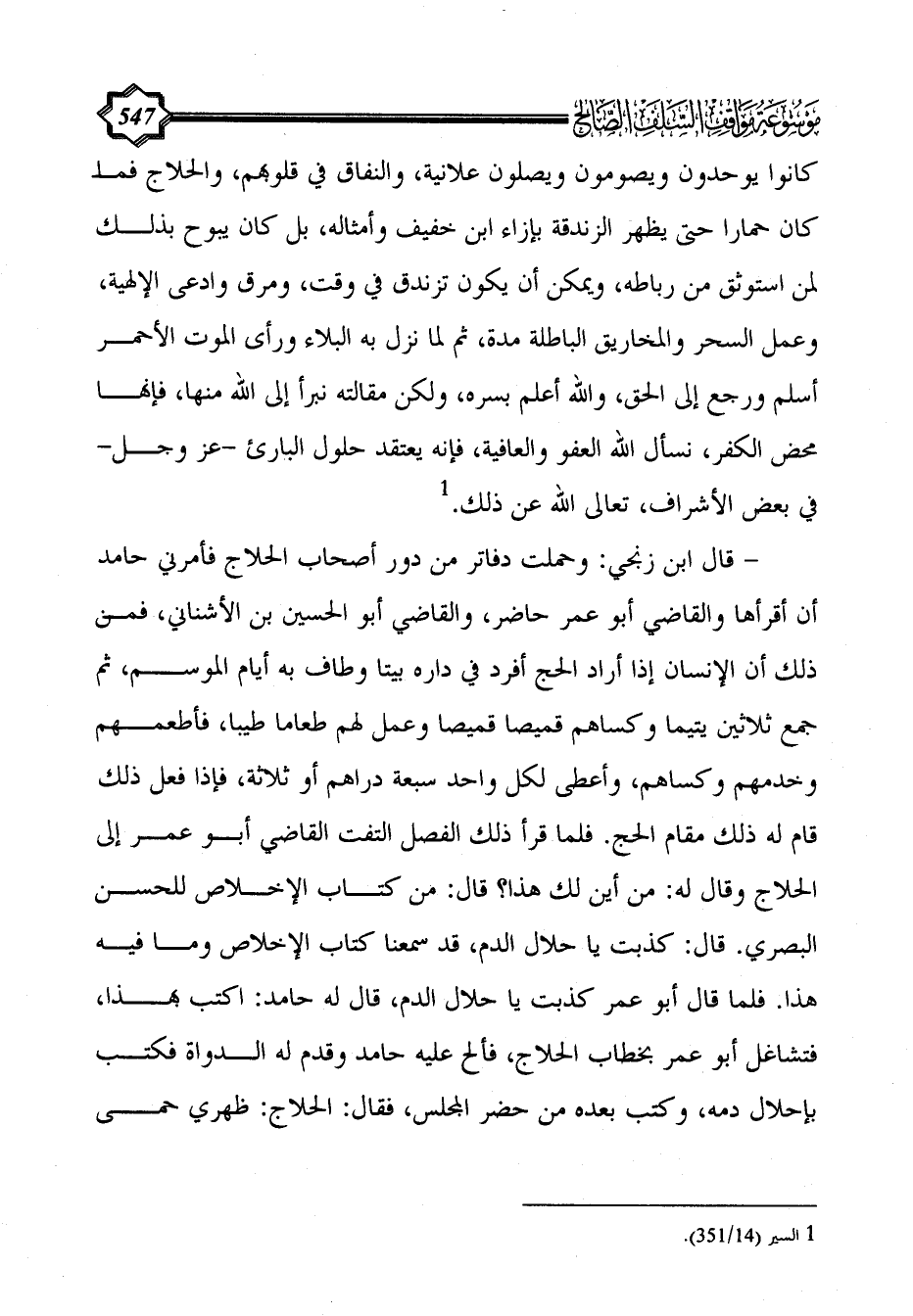 كانوا يوحدون ويصومون ويصلون علانية، والنفاق في قلوبهم، والحلاج فما كان حماراً حتى يظهر الزندقة بإزاء ابن خفيف وأمثاله، بل كان يبوح بذلك لمن استوثق من رباطه، ويمكن أن يكون تزندق في وقت، ومرق وادعى الإلهية، وعمل السحر والمخاريق الباطلة مدة، ثم لما نزل به البلاء ورأى الموت الأحمر أسلم ورجع إلى الحق، والله أعلم بسره، ولكن مقالته نبرأ إلى الله منها، فإنها محض الكفر، نسأل الله العفو والعافية، فإنه يعتقد حلول البارئ -عز وجل- في بعض الأشراف، تعالى الله عن ذلك. (¬1)