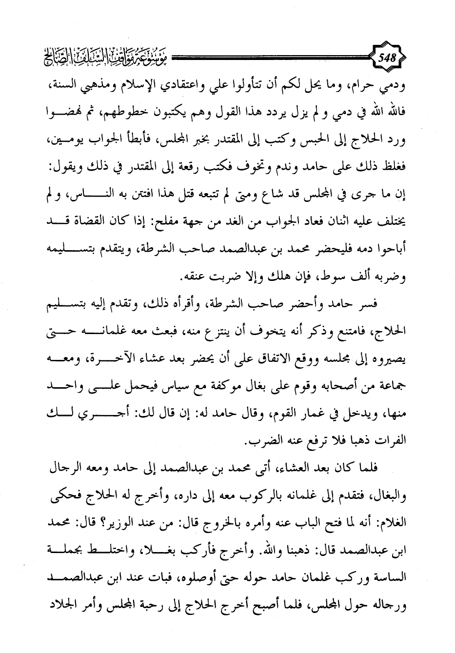 ودمي حرام، وما يحل لكم أن تتأولوا علي واعتقادي الإسلام ومذهبي السنة، فالله الله في دمي ولم يزل يردد هذا القول وهم يكتبون خطوطهم، ثم نهضوا ورد الحلاج إلى الحبس وكتب إلى المقتدر بخبر المجلس، فأبطأ الجواب يومين، فغلظ ذلك على حامد وندم وتخوف فكتب رقعة إلى المقتدر في ذلك ويقول: إن ما جرى في المجلس قد شاع ومتى لم تتبعه قتل هذا افتتن به الناس، ولم يختلف عليه اثنان فعاد الجواب من الغد من جهة مفلح: إذا كان القضاة قد أباحوا دمه فليحضر محمد بن عبد الصمد صاحب الشرطة، ويتقدم بتسليمه وضربه ألف سوط، فإن هلك وإلا ضربت عنقه.
