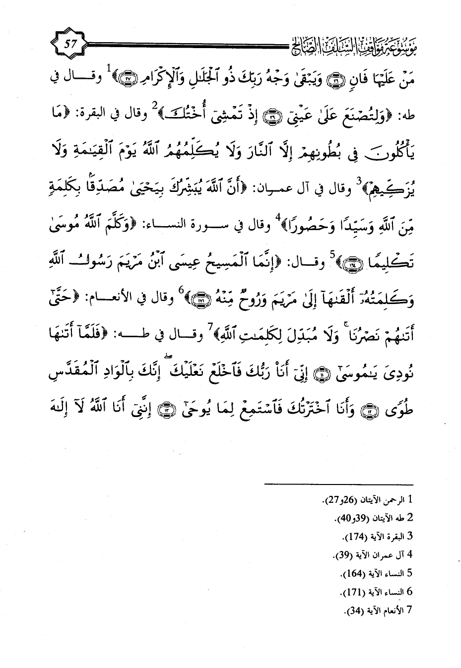 وقال في طه: {وَلِتُصْنَعَ عَلَى عَيْنِي (39) إِذْ تَمْشِي أُخْتُكَ} (¬2) وقال في البقرة: {مَا يَأْكُلُونَ فِي بُطُونِهِمْ إِلَّا النَّارَ وَلَا يُكَلِّمُهُمُ اللَّهُ يَوْمَ الْقِيَامَةِ وَلَا يُزَكِّيهِمْ} (¬3) وقال في آل عمران: {أَنَّ اللَّهَ يُبَشِّرُكَ بِيَحْيَى مُصَدِّقًا بِكَلِمَةٍ مِنَ اللَّهِ وَسَيِّدًا وَحَصُورًا} (¬4) وقال في سورة النساء: {وَكَلَّمَ اللَّهُ موسى تكليمًا} (¬5) وقال: {إِنَّمَا الْمَسِيحُ عِيسَى ابْنُ مَرْيَمَ رَسُولُ اللَّهِ وَكَلِمَتُهُ أَلْقَاهَا إِلَى مَرْيَمَ وَرُوحٌ مِنْهُ} (¬6) وقال في الأنعام: {حَتَّى أَتَاهُمْ نَصْرُنَا وَلَا مُبَدِّلَ لِكَلِمَاتِ اللَّهِ} (¬7) وقال في طه: {فَلَمَّا أَتَاهَا نُودِيَ يَا مُوسَى (11) إِنِّي أَنَا رَبُّكَ فَاخْلَعْ نَعْلَيْكَ إِنَّكَ بِالْوَادِ الْمُقَدَّسِ طُوًى (12) وَأَنَا اخْتَرْتُكَ فَاسْتَمِعْ لِمَا يُوحَى (13) إِنَّنِي أَنَا اللَّهُ لَا إِلَهَ