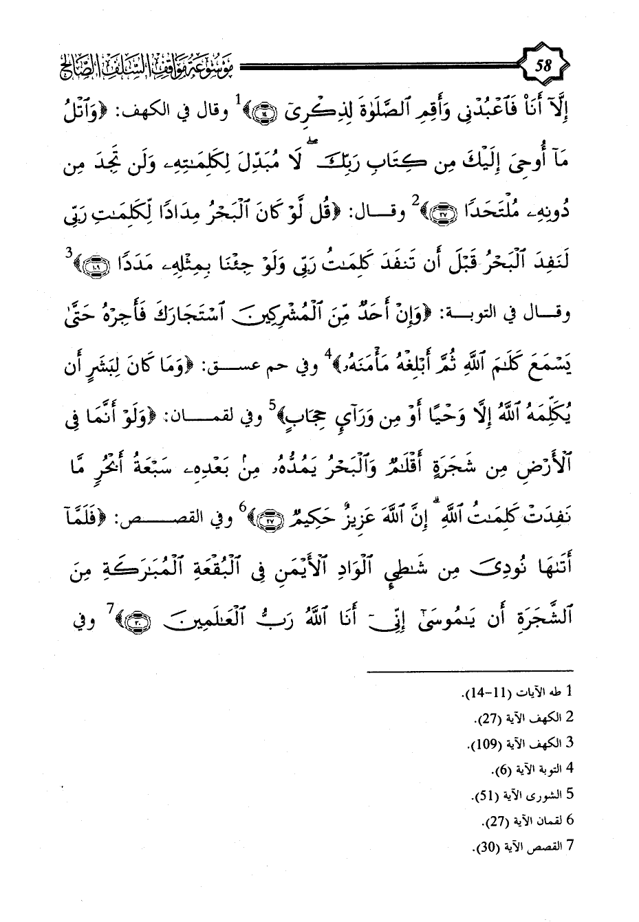 {إِلَّا أَنَا فَاعْبُدْنِي وَأَقِمِ الصَّلَاةَ لِذِكْرِي} (¬1) وقال في الكهف: {وَاتْلُ مَا أُوحِيَ إِلَيْكَ مِنْ كِتَابِ رَبِّكَ لَا مُبَدِّلَ لِكَلِمَاتِهِ وَلَنْ تَجِدَ مِنْ دُونِهِ مُلْتَحَدًا} (¬2) وقال: {قُلْ لَوْ كَانَ الْبَحْرُ مِدَادًا لِكَلِمَاتِ رَبِّي لَنَفِدَ الْبَحْرُ قَبْلَ أَنْ تَنْفَدَ كَلِمَاتُ رَبِّي وَلَوْ جِئْنَا بِمِثْلِهِ مَدَدًا} (¬3)