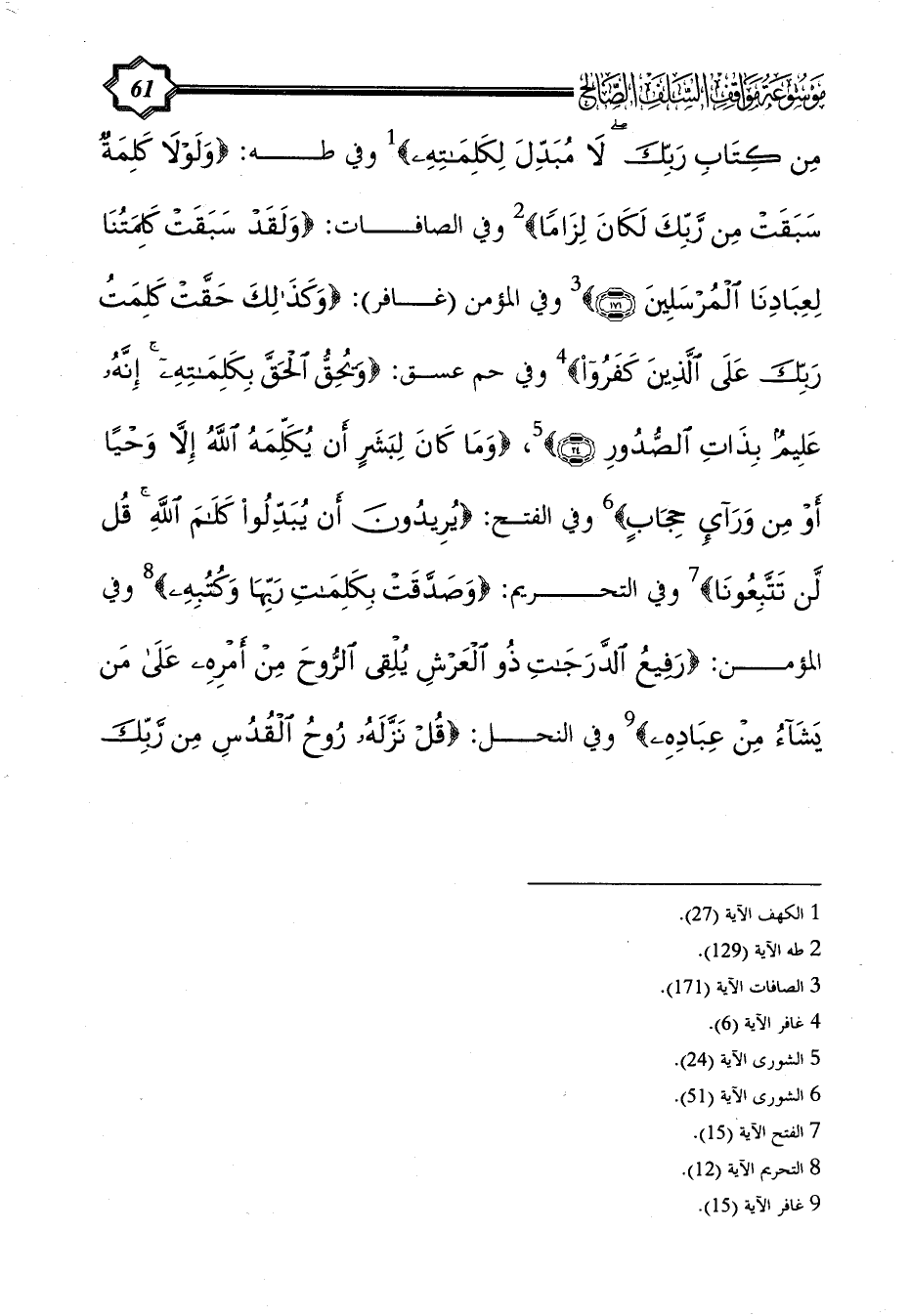 مِنْ كِتَابِ رَبِّكَ لَا مُبَدِّلَ لِكَلِمَاتِهِ} (¬1) وفي طه: {وَلَوْلَا كَلِمَةٌ سَبَقَتْ مِنْ رَبِّكَ لَكَانَ لِزَامًا} (¬2) وفي الصافات: {وَلَقَدْ سَبَقَتْ كَلِمَتُنَا لِعِبَادِنَا الْمُرْسَلِينَ} (¬3) وفي المؤمن (غافر): {وَكَذَلِكَ حَقَّتْ كَلِمَتُ رَبِّكَ عَلَى الَّذِينَ كَفَرُوا} (¬4) وفي حم عسق: {وَيُحِقُّ الْحَقَّ بِكَلِمَاتِهِ إِنَّهُ عَلِيمٌ بِذَاتِ الصُّدُورِ} (¬5)، {وَمَا كَانَ لِبَشَرٍ أَنْ يُكَلِّمَهُ اللَّهُ إِلَّا وَحْيًا أَوْ مِنْ وَرَاءِ حِجَابٍ} (¬6) وفي الفتح: {يُرِيدُونَ أَنْ يُبَدِّلُوا كَلَامَ اللَّهِ قُلْ لَنْ تَتَّبِعُونَا} (¬7) وفي التحريم: {وَصَدَّقَتْ بِكَلِمَاتِ رَبِّهَا وَكُتُبِهِ} (¬8) وفي المؤمن: {رَفِيعُ الدَّرَجَاتِ ذُو الْعَرْشِ يُلْقِي الرُّوحَ مِنْ أَمْرِهِ عَلَى مَنْ يَشَاءُ مِنْ عِبَادِهِ} (¬9) وفي النحل: {قُلْ نَزَّلَهُ رُوحُ الْقُدُسِ مِنْ رَبِّكَ