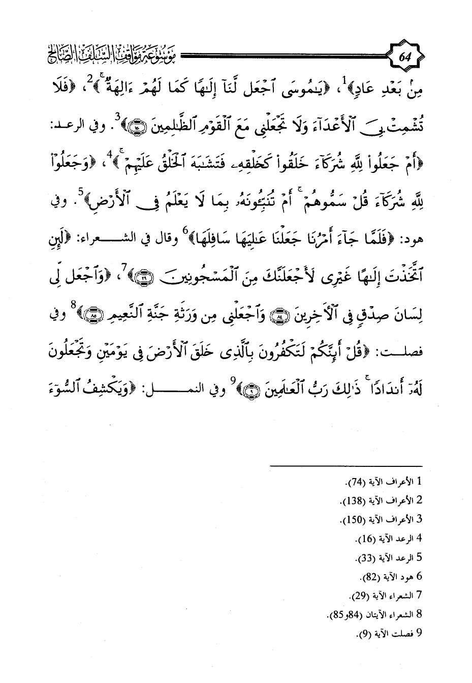 مِنْ بَعْدِ عَادٍ} (¬1)، {يَا مُوسَى اجْعَلْ لَنَا إِلَهًا كَمَا لَهُمْ آلِهَةٌ} (¬2)، {فَلَا تُشْمِتْ بِيَ الْأَعْدَاءَ وَلَا تَجْعَلْنِي مَعَ الْقَوْمِ الظَّالِمِينَ} (¬3). وفي الرعد: {أَمْ جَعَلُوا لِلَّهِ شُرَكَاءَ خَلَقُوا كَخَلْقِهِ فَتَشَابَهَ الْخَلْقُ عَلَيْهِمْ} (¬4)، {وَجَعَلُوا لِلَّهِ شُرَكَاءَ قُلْ سَمُّوهُمْ أَمْ تُنَبِّئُونَهُ بِمَا لَا يَعْلَمُ فِي الْأَرْضِ} (¬5). وفي هود: {فَلَمَّا جَاءَ أَمْرُنَا جَعَلْنَا عَالِيَهَا سَافِلَهَا} (¬6) وقال في الشعراء: {قَالَ لَئِنِ اتَّخَذْتَ إِلَهًا غَيْرِي لَأَجْعَلَنَّكَ مِنَ الْمَسْجُونِينَ} (¬7)،