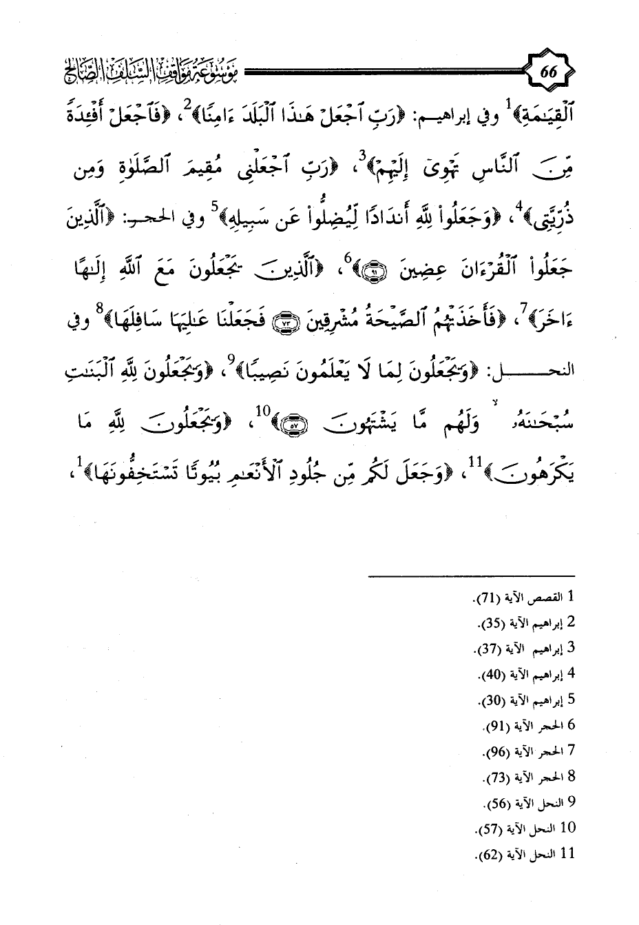 الْقِيَامَةِ} (¬1) وفي إبراهيم: {رَبِّ اجْعَلْ هَذَا الْبَلَدَ آمِنًا} (¬2)، {فَاجْعَلْ أَفْئِدَةً مِنَ النَّاسِ تَهْوِي إِلَيْهِمْ} (¬3)، {رَبِّ اجْعَلْنِي مُقِيمَ الصَّلَاةِ وَمِنْ ذُرِّيَّتِي} (¬4)، {وَجَعَلُوا لِلَّهِ أَنْدَادًا لِيُضِلُّوا عَنْ سَبِيلِهِ} (¬5) وفي الحجر: {الَّذِينَ جَعَلُوا الْقُرْآَنَ عِضِينَ} (¬6)، {الَّذِينَ يَجْعَلُونَ مَعَ اللَّهِ إِلَهًا آخَرَ} (¬7)، {فَأَخَذَتْهُمُ الصَّيْحَةُ مُشْرِقِينَ (73) فَجَعَلْنَا عَالِيَهَا سَافِلَهَا} (¬8) وفي النحل: {وَيَجْعَلُونَ لِمَا لَا يَعْلَمُونَ نَصِيبًا} (¬9)، {وَيَجْعَلُونَ لِلَّهِ الْبَنَاتِ سُبْحَانَهُ وَلَهُمْ مَا يَشْتَهُونَ} (¬10)، {وَيَجْعَلُونَ لِلَّهِ مَا يَكْرَهُونَ} (¬11)، {وَجَعَلَ لَكُمْ مِنْ جُلُودِ الْأَنْعَامِ بُيُوتًا تَسْتَخِفُّونَهَا}،