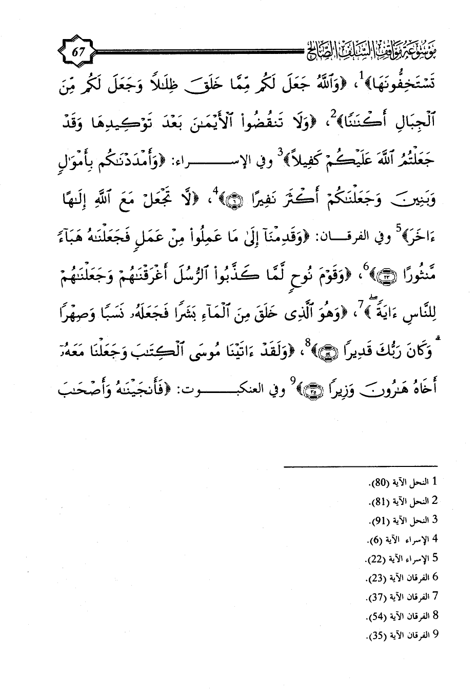 تَسْتَخِفُّونَهَا} (¬1)، {وَاللَّهُ جَعَلَ لَكُمْ مِمَّا خَلَقَ ظِلَالًا وَجَعَلَ لَكُمْ مِنَ الْجِبَالِ أَكْنَانًا} (¬2)، {وَلَا تَنْقُضُوا الْأَيْمَانَ بَعْدَ تَوْكِيدِهَا وَقَدْ جَعَلْتُمُ اللَّهَ عَلَيْكُمْ كَفِيلًا} (¬3) وفي الإسراء: {وَأَمْدَدْنَاكُمْ بِأَمْوَالٍ وَبَنِينَ وَجَعَلْنَاكُمْ أَكْثَرَ نَفِيرًا} (¬4)، {لَا تَجْعَلْ مَعَ اللَّهِ إِلَهًا آخَرَ} (¬5) وفي الفرقان: {وَقَدِمْنَا إِلَى مَا عَمِلُوا مِنْ عَمَلٍ فَجَعَلْنَاهُ هَبَاءً مَنْثُورًا} (¬6)، {وَقَوْمَ نُوحٍ لَمَّا كَذَّبُوا الرُّسُلَ أَغْرَقْنَاهُمْ وَجَعَلْنَاهُمْ لِلنَّاسِ آيَةً} (¬7)، {وَهُوَ الَّذِي خَلَقَ مِنَ الْمَاءِ بَشَرًا فَجَعَلَهُ نَسَبًا وَصِهْرًا وَكَانَ رَبُّكَ قَدِيرًا} (¬8)، {وَلَقَدْ آتَيْنَا مُوسَى الْكِتَابَ وَجَعَلْنَا مَعَهُ أَخَاهُ هَارُونَ وَزِيرًا} (¬9)، وفي العنكبوت: {فَأَنْجَيْنَاهُ وَأَصْحَابَ