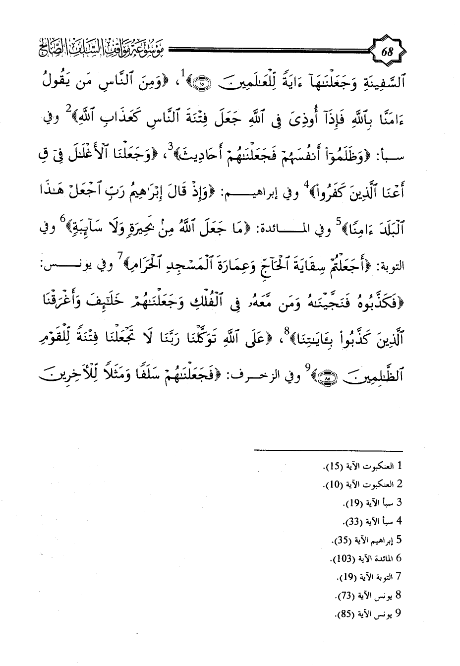 {السَّفِينَةِ وَجَعَلْنَاهَا آيَةً لِلْعَالَمِينَ} (¬1)، {وَمِنَ النَّاسِ مَنْ يَقُولُ آمَنَّا بِاللَّهِ فَإِذَا أُوذِيَ فِي اللَّهِ جَعَلَ فِتْنَةَ النَّاسِ كَعَذَابِ اللَّهِ} (¬2) وفي سبأ: {وَظَلَمُوا أَنْفُسَهُمْ فَجَعَلْنَاهُمْ أَحَادِيثَ} (¬3) {وَجَعَلْنَا الْأَغْلَالَ فِي أَعْنَاقِ الَّذِينَ كَفَرُوا} (¬4) وفي إبراهيم: {وَإِذْ قَالَ إِبْرَاهِيمُ رَبِّ اجْعَلْ هَذَا الْبَلَدَ آمِنًا} (¬5) وفي المائدة: {مَا جَعَلَ اللَّهُ مِنْ بَحِيرَةٍ وَلَا سَائِبَةٍ} (¬6) وفي التوبة: {أَجَعَلْتُمْ سِقَايَةَ الْحَاجِّ وَعِمَارَةَ الْمَسْجِدِ الْحَرَامِ} (¬7) وفي يونس: {فَكَذَّبُوهُ فَنَجَّيْنَاهُ وَمَنْ مَعَهُ فِي الْفُلْكِ وَجَعَلْنَاهُمْ خَلَائِفَ وَأَغْرَقْنَا الَّذِينَ كَذَّبُوا بِآيَاتِنَا} (¬8)، {عَلَى اللَّهِ تَوَكَّلْنَا رَبَّنَا لَا تَجْعَلْنَا فِتْنَةً لِلْقَوْمِ الظَّالِمِينَ} (¬9) وفي الزخرف: {فَجَعَلْنَاهُمْ سَلَفًا وَمَثَلًا لِلْآخِرِينَ}