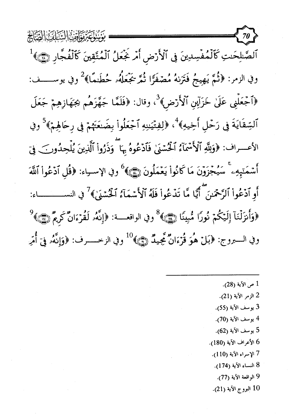 وقال: {فَلَمَّا جَهَّزَهُمْ بِجَهَازِهِمْ جَعَلَ السِّقَايَةَ فِي رَحْلِ أَخِيهِ} (¬4)، {لِفِتْيَانِهِ اجْعَلُوا بِضَاعَتَهُمْ فِي رِحَالِهِمْ} (¬5) وفي الأعراف: {وَلِلَّهِ الْأَسْمَاءُ الْحُسْنَى فَادْعُوهُ بِهَا وَذَرُوا الَّذِينَ يُلْحِدُونَ فِي أَسْمَائِهِ سَيُجْزَوْنَ مَا كَانُوا يَعْمَلُونَ} (¬6) وفي الإسراء: {قُلِ ادْعُوا اللَّهَ أَوِ ادْعُوا الرَّحْمَنَ أَيًّا مَا تَدْعُوا فَلَهُ الْأَسْمَاءُ الْحُسْنَى} (¬7) في النساء: {وَأَنْزَلْنَا إِلَيْكُمْ نُورًا مُبِينًا} (¬8) وفي الواقعة: {إِنَّهُ لَقُرْآَنٌ كَرِيمٌ} (¬9) وفي البروج: {بَلْ هُوَ قُرْآَنٌ مجيدٌ} (¬10) وفي الزخرف: {وَإِنَّهُ في أُمِّ