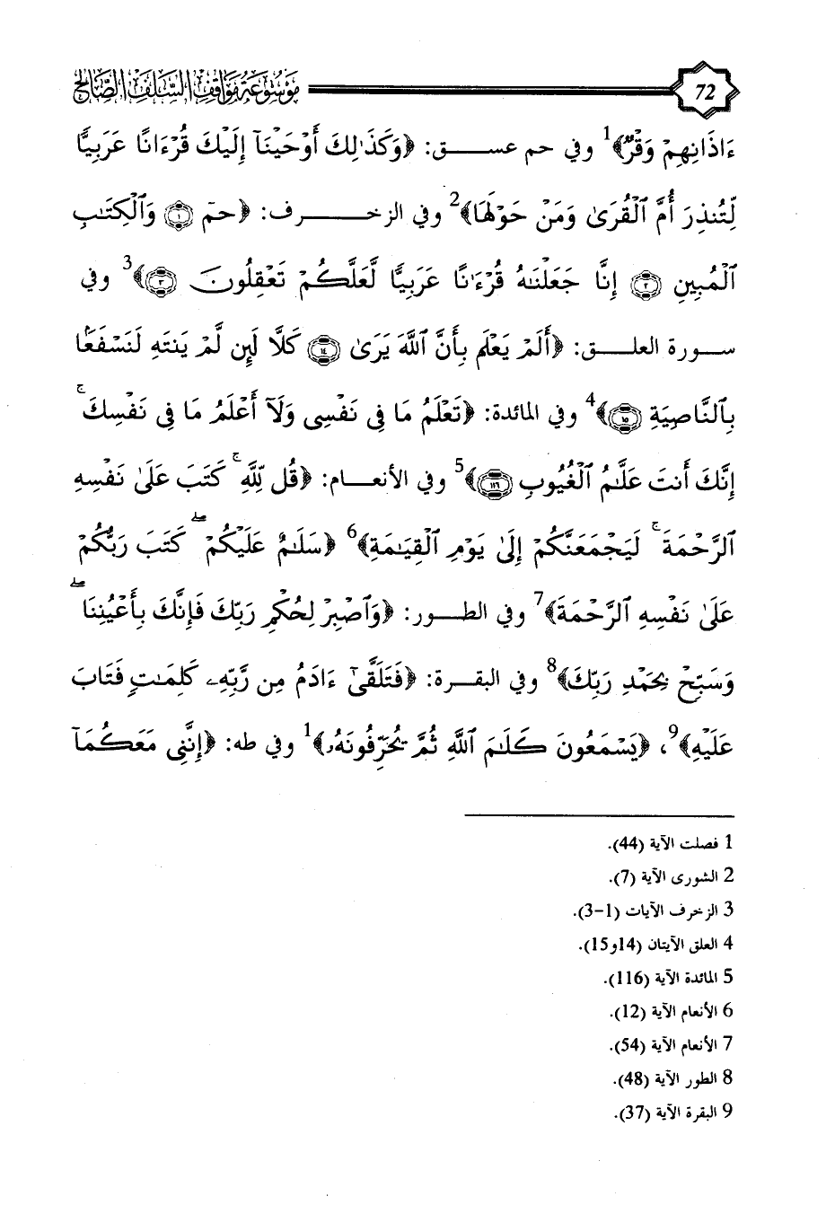 آذَانِهِمْ وَقْرٌ} (¬1) وفي حم عسق: {وَكَذَلِكَ أَوْحَيْنَا إِلَيْكَ قُرْآنًا عَرَبِيًّا لِتُنْذِرَ أُمَّ الْقُرَى وَمَنْ حَوْلَهَا} (¬2) وفي الزخرف: {حم (1) وَالْكِتَابِ الْمُبِينِ (2) إِنَّا جَعَلْنَاهُ قُرْآنًا عَرَبِيًّا لَعَلَّكُمْ تَعْقِلُونَ} (¬3) وفي سورة العلق: {أَلَمْ يَعْلَمْ بِأَنَّ اللَّهَ يَرَى (14) كَلَّا لَئِنْ لَمْ يَنْتَهِ لَنَسْفَعًا بِالنَّاصِيَةِ} (¬4) وفي المائدة: {تَعْلَمُ مَا فِي نَفْسِي وَلَا أَعْلَمُ مَا فِي نَفْسِكَ إِنَّكَ أَنْتَ عَلَّامُ الْغُيُوبِ} (¬5) وفي الأنعام: {كَتَبَ عَلَى نَفْسِهِ الرَّحْمَةَ لَيَجْمَعَنَّكُمْ إِلَى يَوْمِ الْقِيَامَةِ} (¬6) {سَلَامٌ عَلَيْكُمْ كَتَبَ رَبُّكُمْ عَلَى نَفْسِهِ الرَّحْمَةَ} (¬7) وفي الطور: {وَاصْبِرْ لِحُكْمِ رَبِّكَ فَإِنَّكَ بِأَعْيُنِنَا وَسَبِّحْ بِحَمْدِ رَبِّكَ} (¬8)