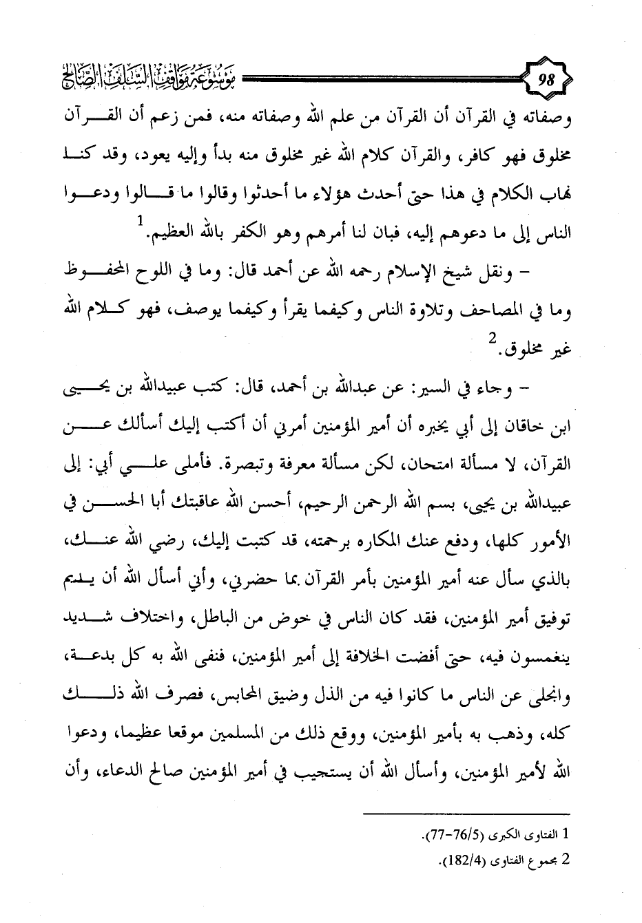 - ونقل شيخ الإسلام رحمه الله عن أحمد قال: وما في اللوح المحفوظ وما في المصاحف وتلاوة الناس وكيفما يقرأ وكيفما يوصف، فهو كلام الله غير مخلوق. (¬2)
