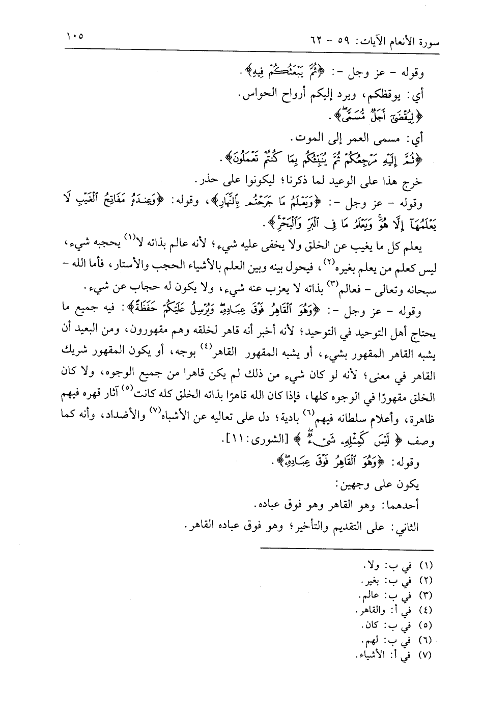 وقوله - عَزَّ وَجَلَّ -: (وَهُوَ الْقَاهِرُ فَوْقَ عِبَادِهِ وَيُرْسِلُ عَلَيْكُمْ حَفَظَةً ... (61) فيه جميع ما يحتاج أهل التوحيد في التوحيد؛ لأنه أخبر أنه قاهر لخلقه وهم مقهورون، ومن البعيد أن يشبه القاهر المقهور بشيء، أو يشبه المقهور القاهر بوجه، أو يكون المقهور شريك القاهر في معنى؛ لأنه لو كان شيء من ذلك لم يكن قاهرا من جميع الوجوه، ولا كان الخلق مقهورًا في الوجوه كلها، فإذا كان اللَّه قاهرًا بذاته الخلق كله كانت آثار قهره فيهم ظاهرة، وأعلام سلطانه فيهم بادية؛ دل على تعاليه عن الأشباه والأضداد، وأنه كما وصف (لَيْسَ كَمِثْلِهِ شَيْءٌ).