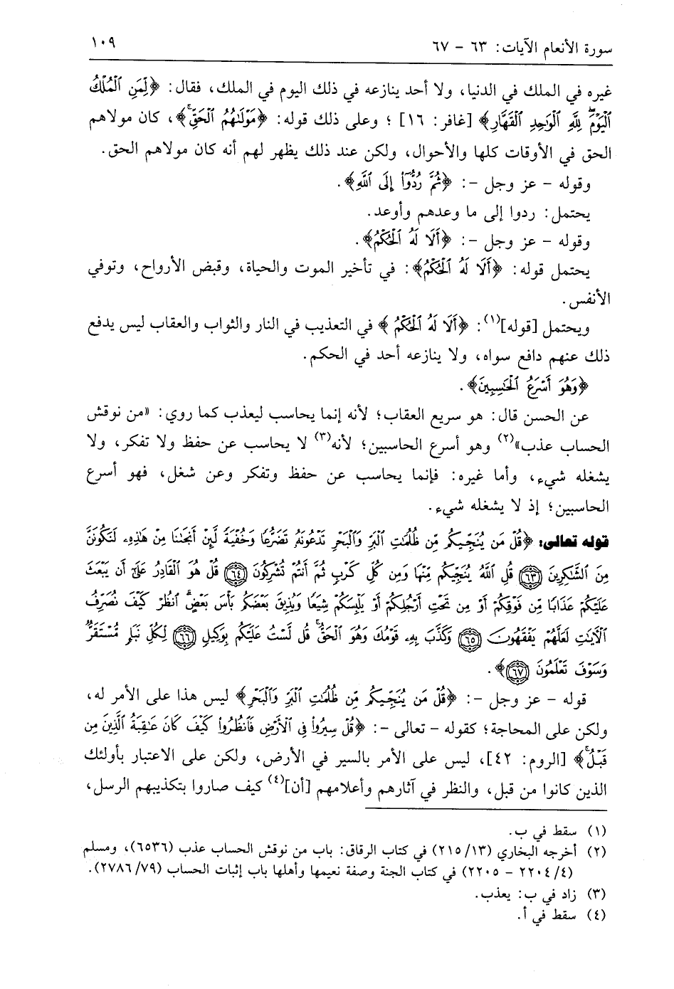 يحتمل قوله: (أَلَا لَهُ الْحُكْمُ): في تأخير الموت والحياة، وقبض الأرواح، وتوفي الأنفس.