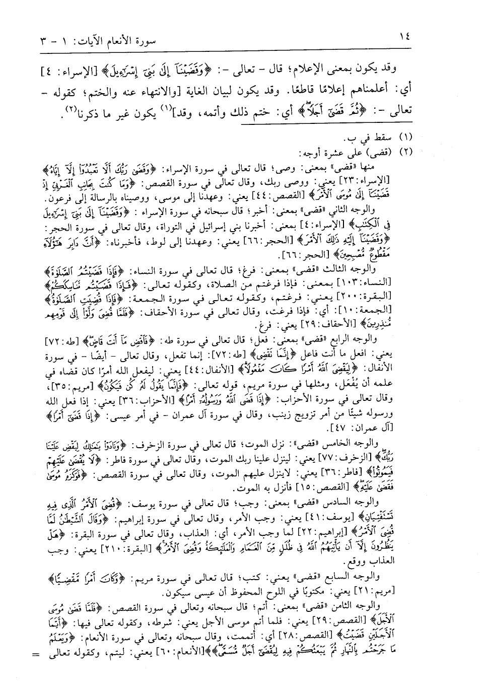 وقد يكون بمعنى الإعلام؛ قال - تعالى -: (وَقَضَيْنَا إِلَى بَنِي إِسْرَائِيلَ)، أي: أعلمناهم إعلامًا قاطعًا. وقد يكون لبيان الغاية والانتهاء عنه والختم؛ كقوله - تعالى -: (ثُمَّ قَضَى أَجَلًا) أي: ختم ذلك وأتمه، وقد يكون غير ما ذكرنا.