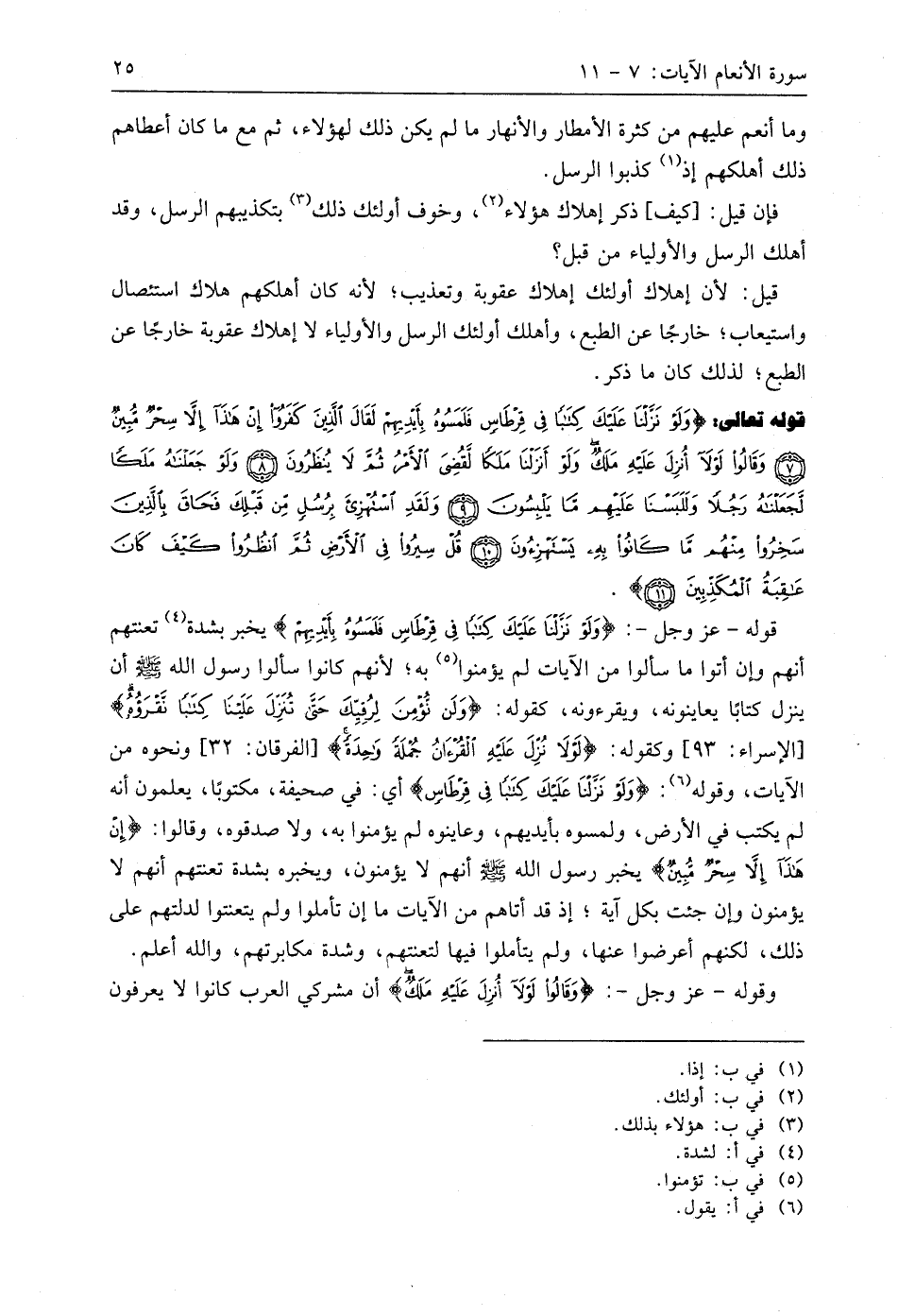 قوله تعالى: (وَلَوْ نَزَّلْنَا عَلَيْكَ كِتَابًا فِي قِرْطَاسٍ فَلَمَسُوهُ بِأَيْدِيهِمْ لَقَالَ الَّذِينَ كَفَرُوا إِنْ هَذَا إِلَّا سِحْرٌ مُبِينٌ (7) وَقَالُوا لَوْلَا أُنْزِلَ عَلَيْهِ مَلَكٌ وَلَوْ أَنْزَلْنَا مَلَكًا لَقُضِيَ الْأَمْرُ ثُمَّ لَا يُنْظَرُونَ (8) وَلَوْ جَعَلْنَاهُ مَلَكًا لَجَعَلْنَاهُ رَجُلًا وَلَلَبَسْنَا عَلَيْهِمْ مَا يَلْبِسُونَ (9) وَلَقَدِ اسْتُهْزِئَ بِرُسُلٍ مِنْ قَبْلِكَ فَحَاقَ بِالَّذِينَ سَخِرُوا مِنْهُمْ مَا كَانُوا بِهِ يَسْتَهْزِءُونَ (10) قُلْ سِيرُوا فِي الْأَرْضِ ثُمَّ انْظُرُوا كَيْفَ كَانَ عَاقِبَةُ الْمُكَذِّبِينَ (11)