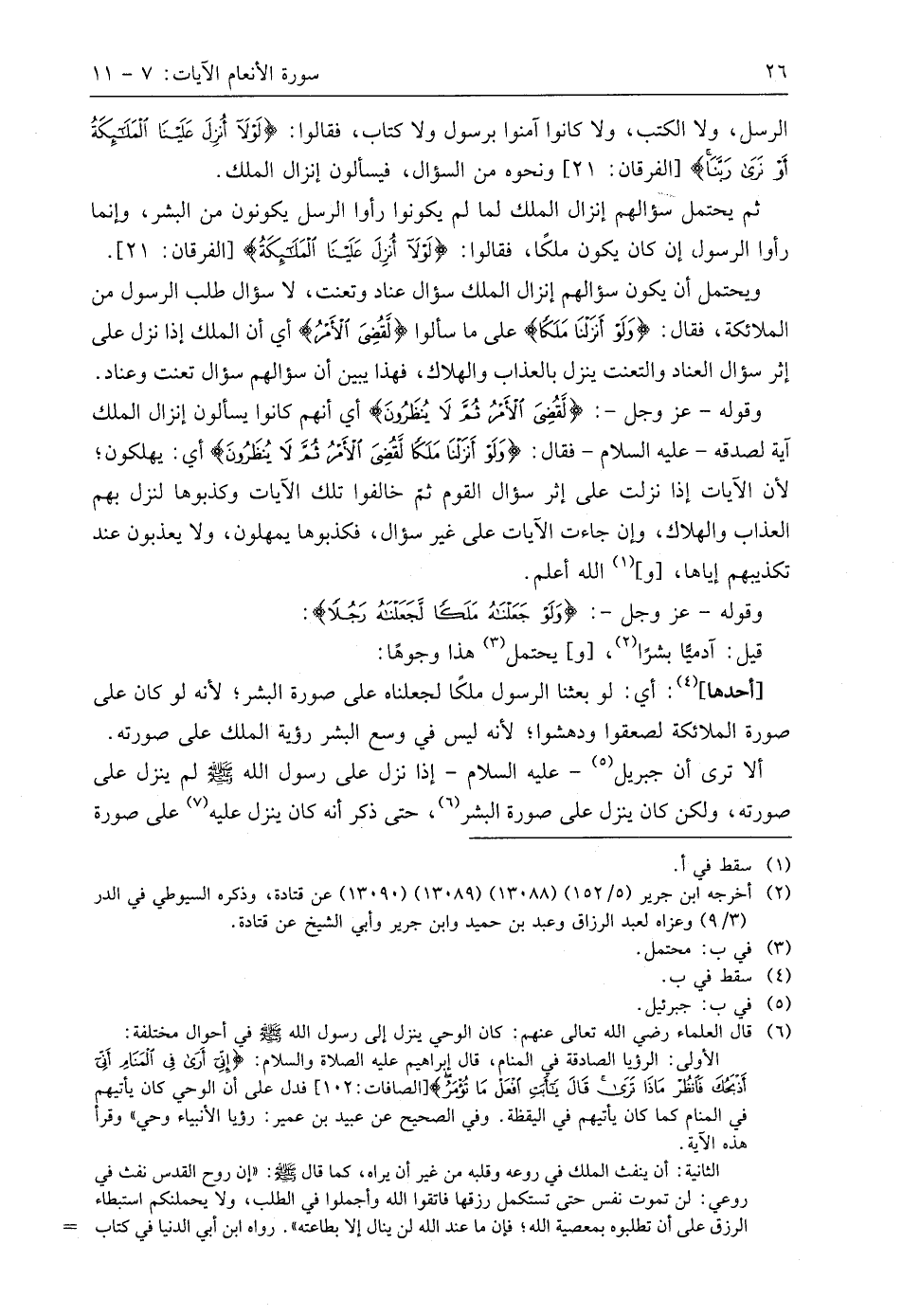 ويحتمل أن يكون سؤالهم إنزال الملك سؤال عناد وتعنت، لا سؤال طلب الرسول من الملائكة، فقال: (وَلَوْ أَنْزَلْنَا مَلَكًا) على ما سألوا (لَقُضِيَ الْأَمْرُ) أي أن الملك إذا نزل على إثر سؤال العناد والتعنت ينزل بالعذاب والهلاك، فهذا يبين أن سؤالهم سؤال تعنت وعناد.
