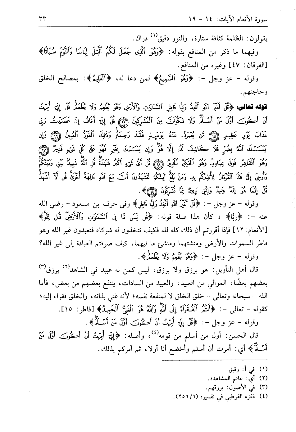 قوله تعالى: (قُلْ أَغَيْرَ اللَّهِ أَتَّخِذُ وَلِيًّا فَاطِرِ السَّمَاوَاتِ وَالْأَرْضِ وَهُوَ يُطْعِمُ وَلَا يُطْعَمُ قُلْ إِنِّي أُمِرْتُ أَنْ أَكُونَ أَوَّلَ مَنْ أَسْلَمَ وَلَا تَكُونَنَّ مِنَ الْمُشْرِكِينَ (14) قُلْ إِنِّي أَخَافُ إِنْ عَصَيْتُ رَبِّي عَذَابَ يَوْمٍ عَظِيمٍ (15) مَنْ يُصْرَفْ عَنْهُ يَوْمَئِذٍ فَقَدْ رَحِمَهُ وَذَلِكَ الْفَوْزُ الْمُبِينُ (16) وَإِنْ يَمْسَسْكَ اللَّهُ بِضُرٍّ فَلَا كَاشِفَ لَهُ إِلَّا هُوَ وَإِنْ يَمْسَسْكَ بِخَيْرٍ فَهُوَ عَلَى كُلِّ شَيْءٍ قَدِيرٌ (17) وَهُوَ الْقَاهِرُ فَوْقَ عِبَادِهِ وَهُوَ الْحَكِيمُ الْخَبِيرُ (18) قُلْ أَيُّ شَيْءٍ أَكْبَرُ شَهَادَةً قُلِ اللَّهُ شَهِيدٌ بَيْنِي وَبَيْنَكُمْ وَأُوحِيَ إِلَيَّ هَذَا الْقُرْآنُ لِأُنْذِرَكُمْ بِهِ وَمَنْ بَلَغَ أَئِنَّكُمْ لَتَشْهَدُونَ أَنَّ مَعَ اللَّهِ آلِهَةً أُخْرَى قُلْ لَا أَشْهَدُ قُلْ إِنَّمَا هُوَ إِلَهٌ وَاحِدٌ وَإِنَّنِي بَرِيءٌ مِمَّا تُشْرِكُونَ (19)