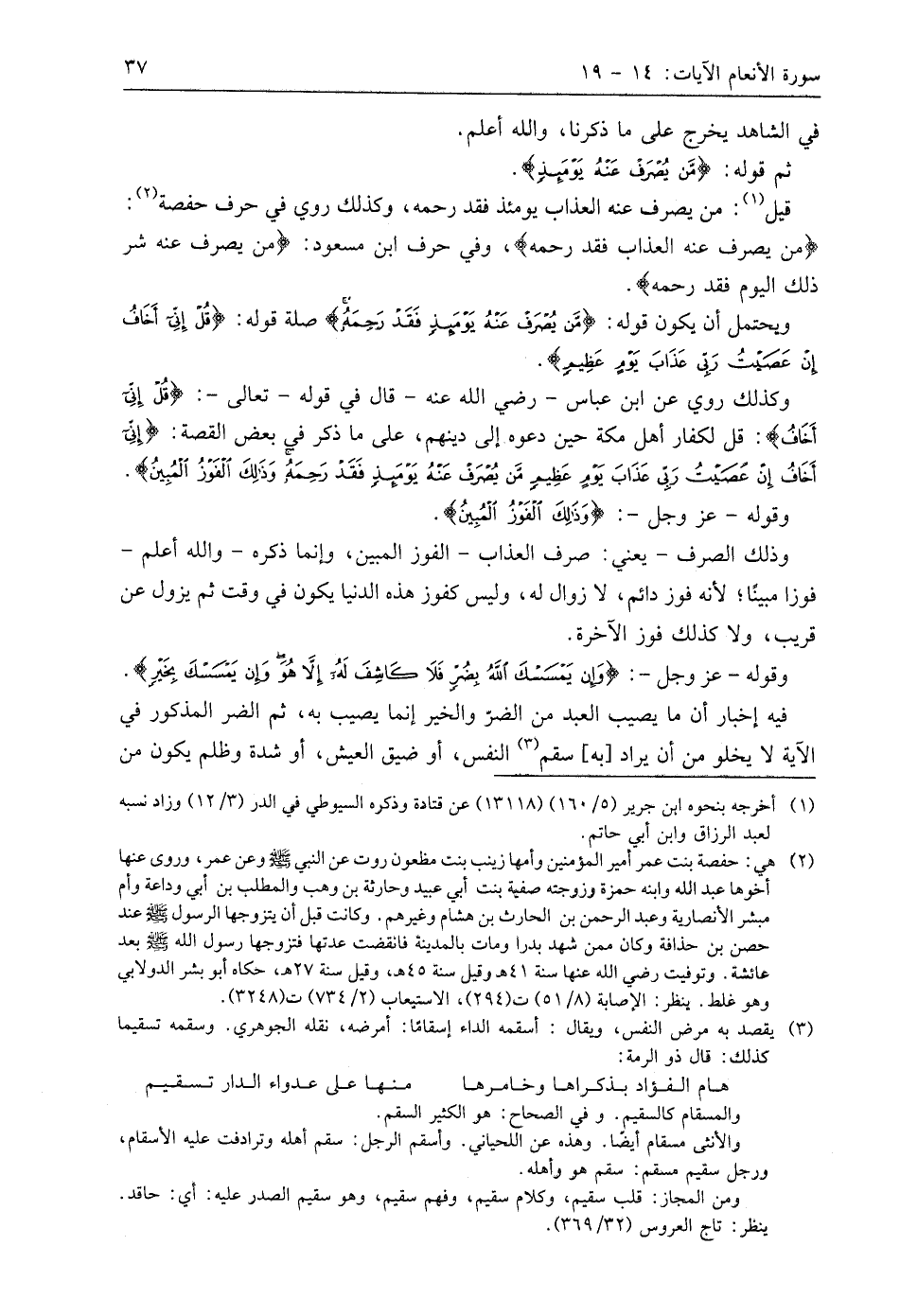 وكذلك روي عن ابن عَبَّاسٍ - رَضِيَ اللَّهُ عَنْهُ - قال في قوله - تعالى -: (قُلْ إِنِّي أَخَافُ): قل لكفار أهل مكة حين دعوه إلى دينهم، على ما ذكر في بعض القصة: (قُلْ إِنِّي أَخَافُ إِنْ عَصَيْتُ رَبِّي عَذَابَ يَوْمٍ عَظِيمٍ (15) مَنْ يُصْرَفْ عَنْهُ يَوْمَئِذٍ فَقَدْ رَحِمَهُ وَذَلِكَ الْفَوْزُ الْمُبِينُ (16). وقوله - عَزَّ وَجَلَّ -: (وَذَلِكَ الْفَوْزُ الْمُبِينُ).