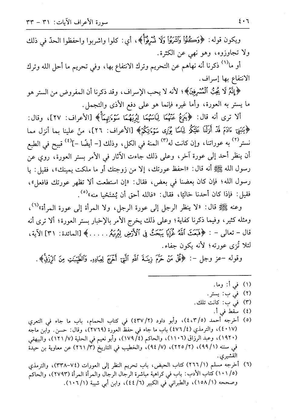 ألا ترى أنه قال: (يَنْزِعُ عَنْهُمَا لِبَاسَهُمَا لِيُرِيَهُمَا سَوْآتِهِمَا)، وقال: (يَا بَنِي آدَمَ قَدْ أَنْزَلْنَا عَلَيْكُمْ لِبَاسًا يُوَارِي سَوْآتِكُمْ)، منَّ علينا بما أنزل مما نستر به عوراتنا، وإن كانت له المنة في الكل، وذلك -أيضًا- قبيح في الطبع أن ينظر أحد إلى عورة آخر، وعلى ذلك جاءت الآثار في الأمر بستر العورة، روي عن رسول اللَّه - صَلَّى اللَّهُ عَلَيهِ وَسَلَّمَ - أنه قال: " احفظ عورتك، إلا من زوجتك أو ما ملكت يمينك "، فقيل: يا رسول اللَّه؛ فإن كان بعضنا في بعض؟، فقال: " إن استطعت ألا تظهر عورتك فافعل ". فقيل: فإذا كان أحدنا خاليًا، فقال: " فاللَّه أحق أن يُسْتَحْيا منه ".