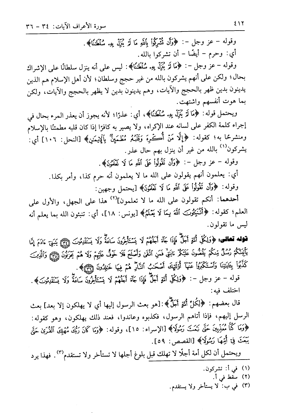 قوله تعالى: (وَلِكُلِّ أُمَّةٍ أَجَلٌ فَإِذَا جَاءَ أَجَلُهُمْ لَا يَسْتَأْخِرُونَ سَاعَةً وَلَا يَسْتَقْدِمُونَ (34) يَا بَنِي آدَمَ إِمَّا يَأْتِيَنَّكُمْ رُسُلٌ مِنْكُمْ يَقُصُّونَ عَلَيْكُمْ آيَاتِي فَمَنِ اتَّقَى وَأَصْلَحَ فَلَا خَوْفٌ عَلَيْهِمْ وَلَا هُمْ يَحْزَنُونَ (35) وَالَّذِينَ كَذَّبُوا بِآيَاتِنَا وَاسْتَكْبَرُوا عَنْهَا أُولَئِكَ أَصْحَابُ النَّارِ هُمْ فِيهَا خَالِدُونَ (36)