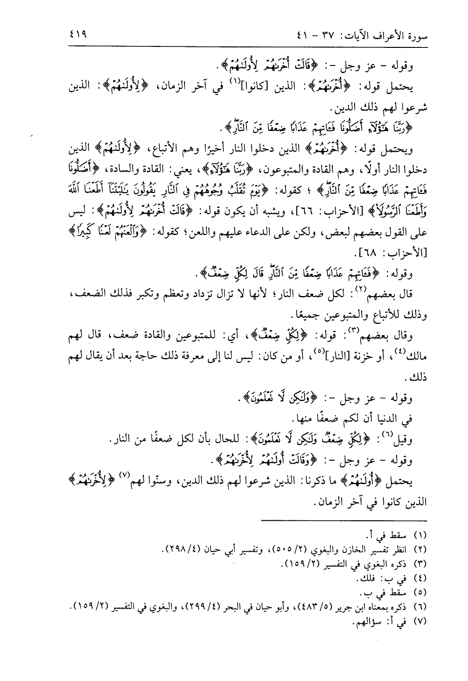 ويحتمل قوله: (أُخْرَاهُمْ) الذين دخلوا النار أخيرًا وهم الأتباع، (لِأُولَاهُمْ) الذين دخلوا النار أولًا، وهم القادة والمتبوعون، (رَبَّنَا هَؤُلَاءِ)، يعني: القادة والسادة، (أَضَلُّونَا فَآتِهِمْ عَذَابًا ضِعْفًا مِنَ النَّارِ) هو؛ كقوله: (يَوْمَ تُقَلَّبُ وُجُوهُهُمْ فِي النَّارِ يَقُولُونَ يَا لَيْتَنَا أَطَعْنَا اللَّهَ وَأَطَعْنَا الرَّسُولَا)، ويشبه أن يكون قوله: (قَالَتْ أُخْرَاهُمْ لِأُولَاهُمْ): ليس على القول بعضهم لبعض، ولكن على الدعاء عليهم واللعن؛ كقوله: (وَالْعَنْهُمْ لَعْنًا كَبِيرًا). وقوله: (فَآتِهِمْ عَذَابًا ضِعْفًا مِنَ النَّارِ قَالَ لِكُلٍّ ضِعْفٌ).