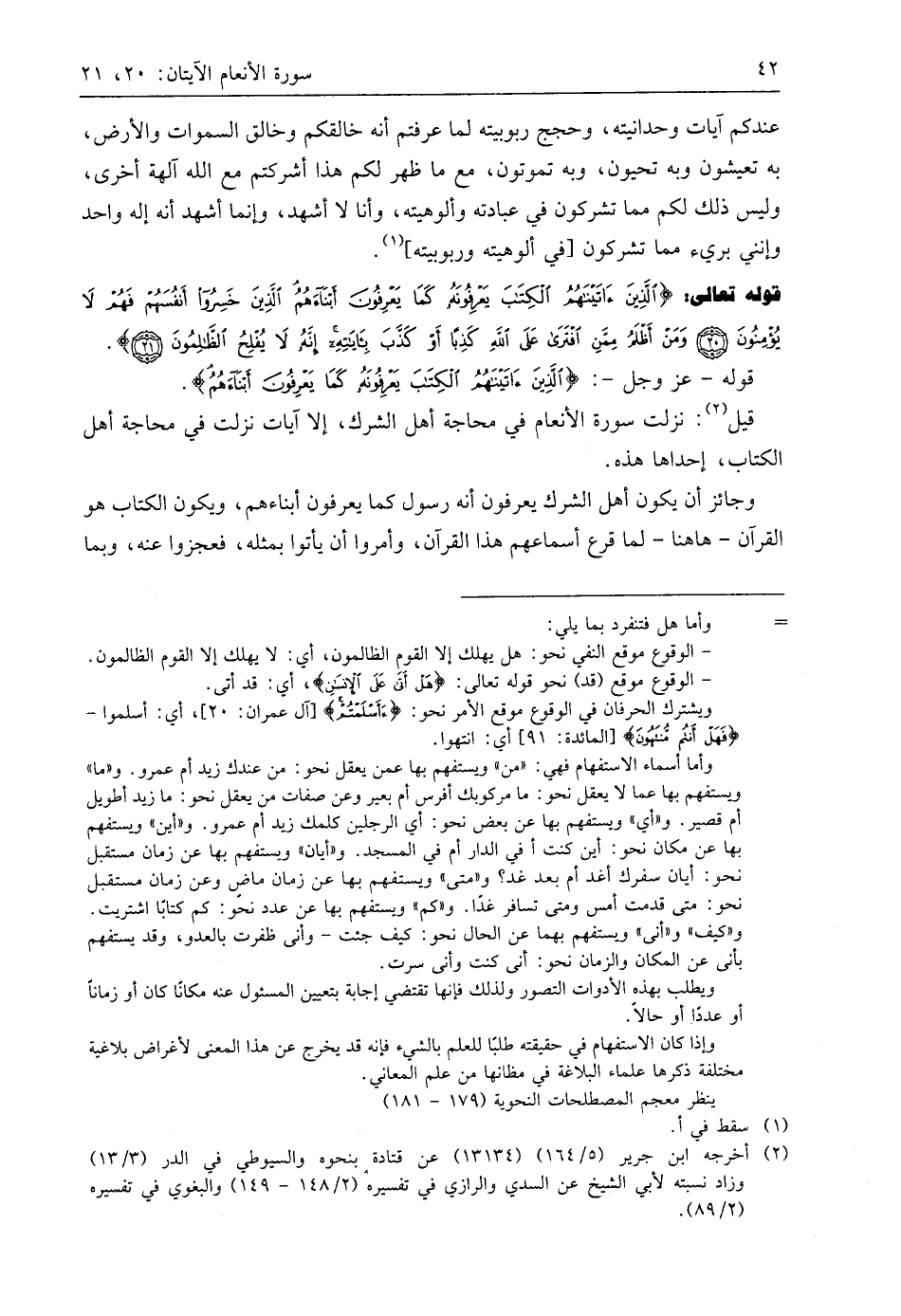 قوله تعالى: (الَّذِينَ آتَيْنَاهُمُ الْكِتَابَ يَعْرِفُونَهُ كَمَا يَعْرِفُونَ أَبْنَاءَهُمُ الَّذِينَ خَسِرُوا أَنْفُسَهُمْ فَهُمْ لَا يُؤْمِنُونَ (20) وَمَنْ أَظْلَمُ مِمَّنِ افْتَرَى عَلَى اللَّهِ كَذِبًا أَوْ كَذَّبَ بِآيَاتِهِ إِنَّهُ لَا يُفْلِحُ الظَّالِمُونَ (21)