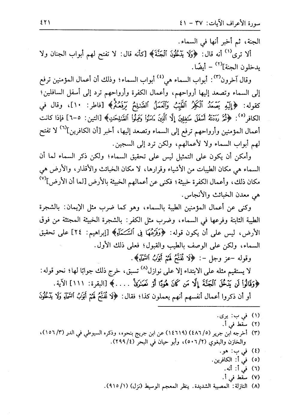 وقال آخرون: أبواب السماء هي أبواب السماء؛ وذلك أن أعمال المؤمنين ترفع إلى السماء وتصعد إليها أرواحهم، وأعمال الكفرة وأرواحهم ترد إلى أسفل السافلين؛ كقوله: (إِلَيْهِ يَصْعَدُ الْكَلِمُ الطَّيِّبُ وَالْعَمَلُ الصَّالِحُ يَرْفَعُهُ)، وقال في الكافر: (ثُمَّ رَدَدْنَاهُ أَسْفَلَ سَافِلِينَ (5) إِلَّا الَّذِينَ آمَنُوا وَعَمِلُوا الصَّالِحَاتِ)، فإذا كانت أعمال المؤمنين وأرواحهم ترفع إلى السماء وتصعد إليها، أخبر أن الكافرين، لا تفتح لهم أبواب السماء ولا لأعمالهم، ولكن ترد إلى السجين.