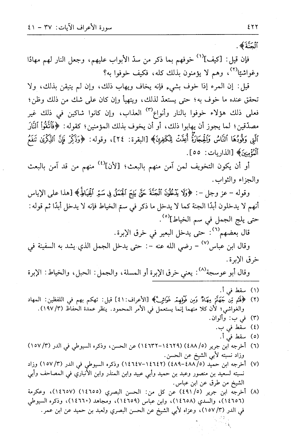 وقوله - عَزَّ وَجَلَّ -: (وَلَا يَدْخُلُونَ الْجَنَّةَ حَتَّى يَلِجَ الْجَمَلُ فِي سَمِّ الْخِيَاطِ) هذا على الإياس أنهم لا يدخلون أبدًا الجنة كما لا يدخل ما ذكر في سمّ الخياط فإنه لا يدخل أبدًا ثم قوله: (حَتَّى يَلِجَ الْجَمَلُ فِي سَمِّ الْخِيَاطِ).