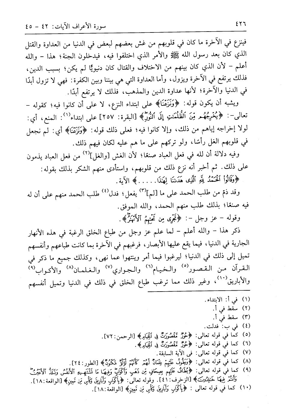 وفيه دلالة أن لله في فعل العباد صنعًا؛ لأن الغش والغل، من فعل العباد يذمون على ذلك. ثم أخبر أنه نزع ذلك من قلوبهم، واستأدى منهم الشكر بذلك بقوله: (وَقَالُوا الْحَمْدُ لِلَّهِ الَّذِي هَدَانَا لِهَذَا. . . . .) الآية.