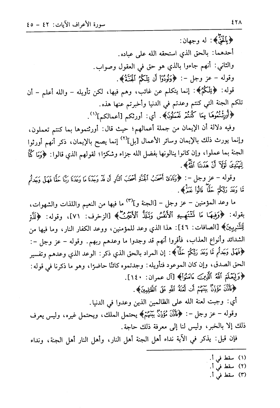 وقوله - عَزَّ وَجَلَّ -: (وَنَادَى أَصْحَابُ الْجَنَّةِ أَصْحَابَ النَّارِ أَنْ قَدْ وَجَدْنَا مَا وَعَدَنَا رَبُّنَا حَقًّا فَهَلْ وَجَدْتُمْ مَا وَعَدَ رَبُّكُمْ حَقًّا قَالُوا نَعَمْ ... (44)