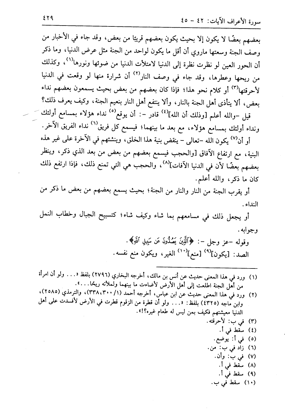 بعضهم بعضًا لا يكون إلا بحيث يكون بعضهم قريبًا من بعض، وقد جاء في الأخبار من وصف الجنة وسعتها ما روي أن أقل ما يكون لواحد من الجنة مثل عرض الدنيا، وما ذكر أن الحور العين لو نظرت نظرة إلى الدنيا لامتلأت الدنيا من ضوئها ونورها، وكذلك من ريحها وعطرها، وقد جاء في وصف النار أن شرارة منها لو وقعت في - الدنيا لأحرقتها أو كلام نحو هذا؛ فإذا كان بعضهم من بعض بحيث يسمعون بعضهم نداء بعض، ألا يتأذى أهل الجنة بالنار، وألا ينتفع أهل النار بنعيم الجنة، وكيف يعرف ذلك؟ قيل - واللَّه أعلم وذلك أن اللَّه قادر -: أن يوقع نداء هَؤُلَاءِ بمسامع أُولَئِكَ ونداء أُولَئِكَ بمسامع هَؤُلَاءِ، مع بعد ما بينهما؛ فيسمع كل فريق نداء الفريق الآخر.