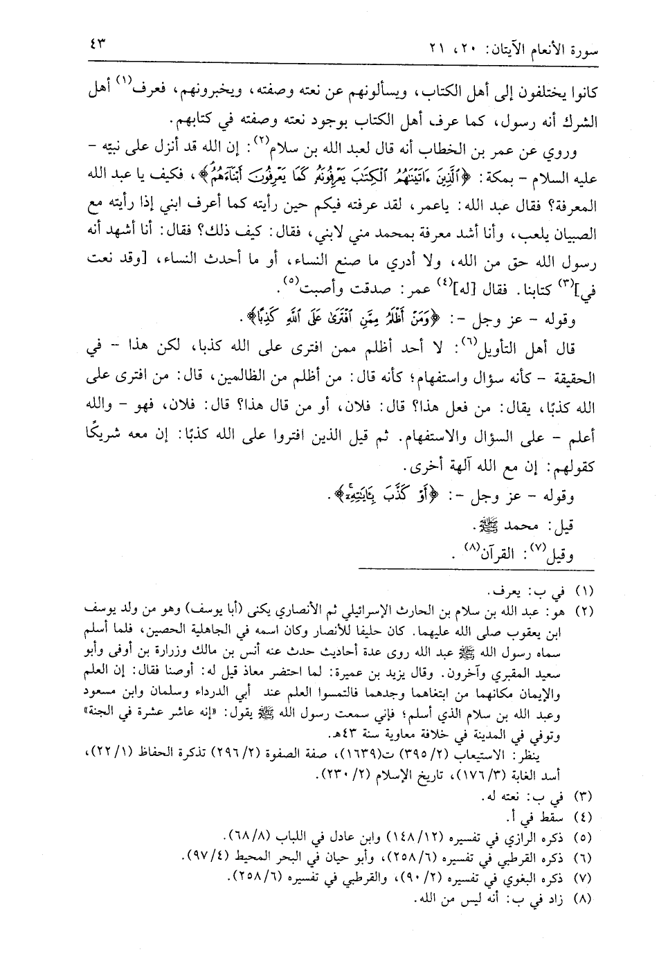 وروي عن عمر بن الخطاب أنه قال لعبد اللَّه بن سلام: إن اللَّه قد أنزل على نبيه - عليه السلام - بمكة: (الَّذِينَ آتَيْنَاهُمُ الْكِتَابَ يَعْرِفُونَهُ كَمَا يَعْرِفُونَ أَبْنَاءَهُمُ)، فكيف يا عبد الله المعرفة؛ فقال عبد اللَّه: يا عمر، لقد عرفته فيكم حين رأيته كما أعرف ابني إذا رأيته مع الصبيان يلعب، وأنا أشد معرفة بمُحَمَّد مني لابني، فقال: كيف ذلك؟ فقال: أنا أشهد أنه رسول اللَّه حق من اللَّه، ولا أدري ما صنع النساء، أو ما أحدث النساء، وقد نعت في كتابنا. فقال له عمر: صدقت وأصبت.